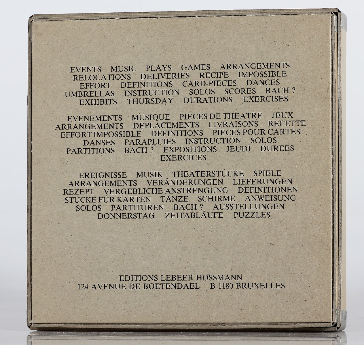 BRECHT GEORGE (1926 - 2008) Water -Yam. 1986. Oggetto. Cm 17,00 x 17,00 x 3,00. Scatola di cartone contenente biglietti. Edition Lebeer Hossmann, Bruxelles Hamburg.