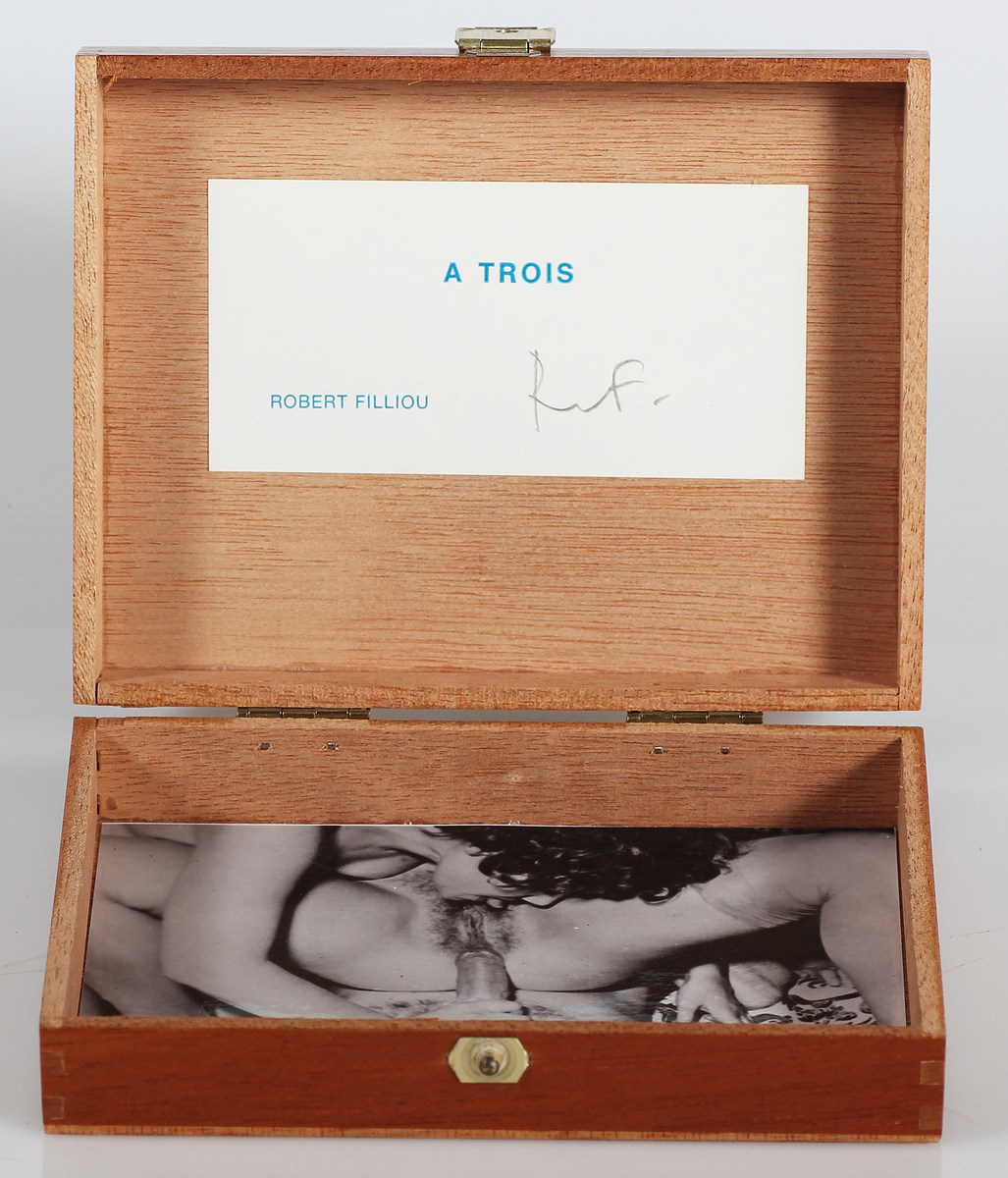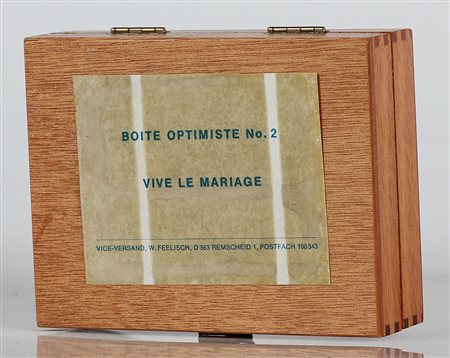 FILLIOU ROBERT (1926 - 1987) Boite optimiste n.2 . Vive le mariage. A Trois. Oggetto. Cm 10,00 x 12,50 x 3,50. Scatola di legno contenente fotografia. All'interno cartiglio descrittivo firmato dall'artista. Al fronte cartiglio descrittivo.