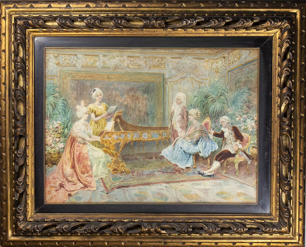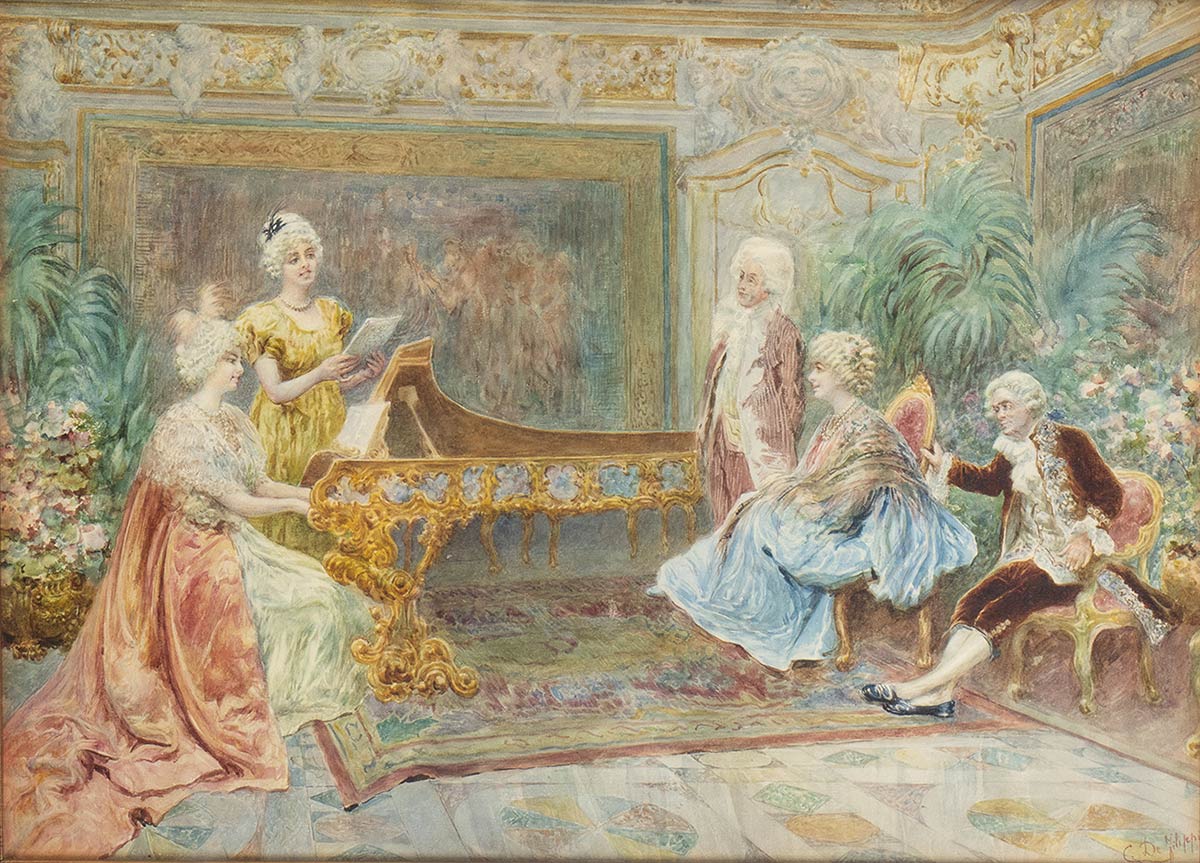 raffigurante personaggi ottocenteschi, firmato e datato in basso a destra "C. De Filippi 1920". Dimensioni 82 x 101 cm. Stato di conservazione: **** buono.