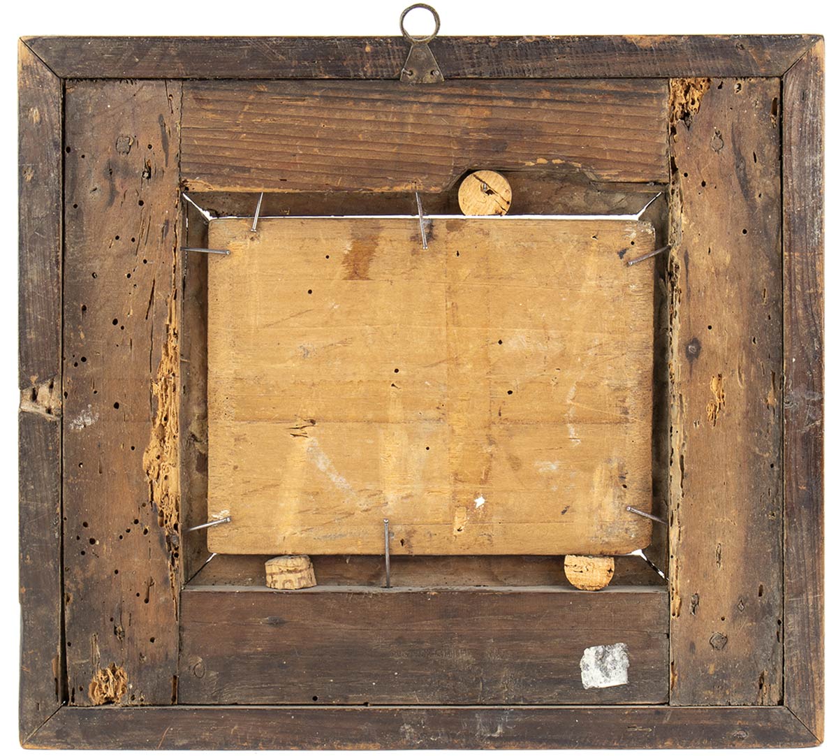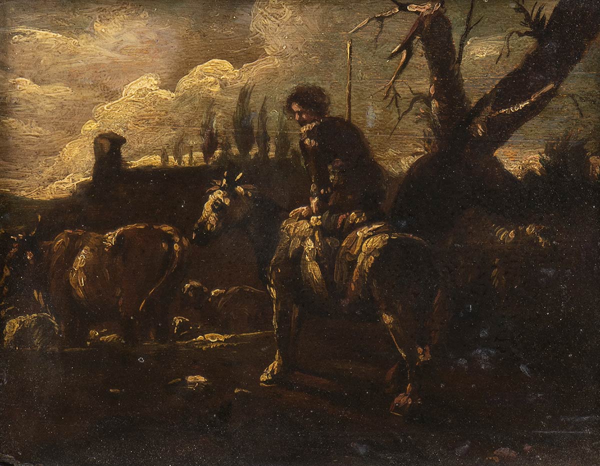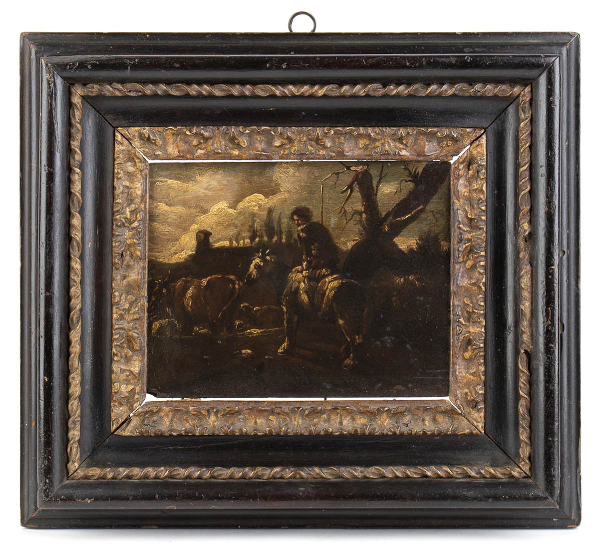 olio su tavola raffigurante pastore con armenti. Dimensioni tavola 15 x 20 cm. Dimensioni cornice 31,3 x 36 cm. Stato di conservazione: **** buono.