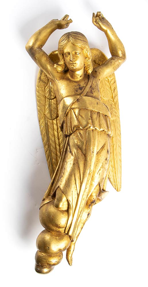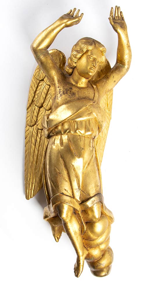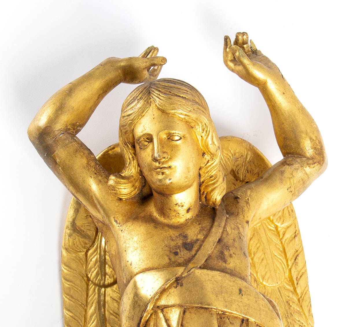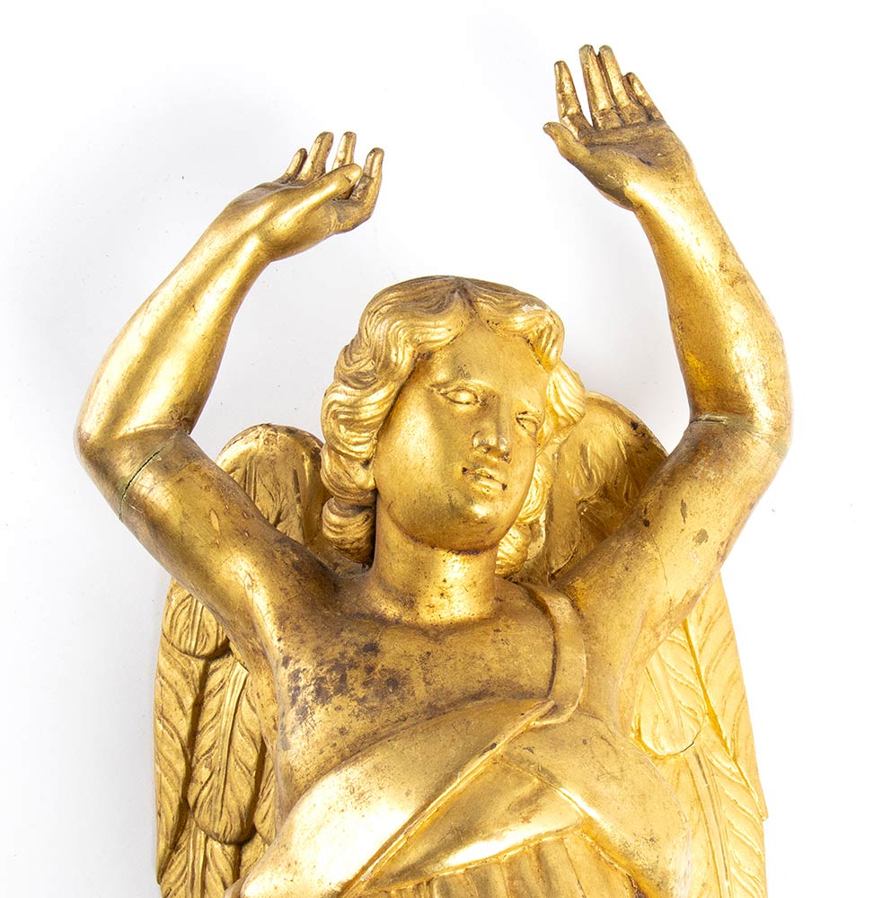 in legno dorato raffiguranti due angeli alati con cornucopia. Altezza 62,5 cm, larghezza 22,5 cm. Stato di conservazione: **** buono (difetti e restauri pregressi).