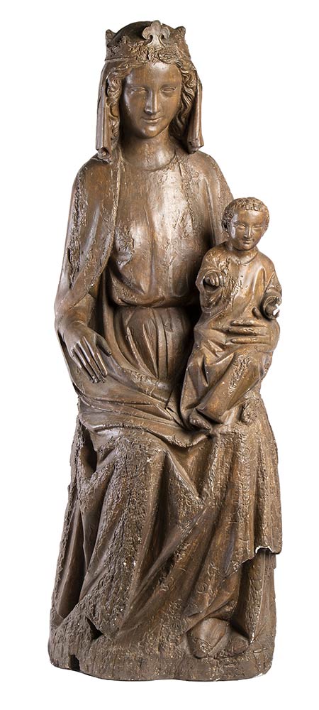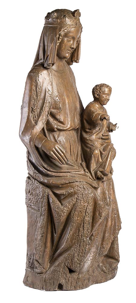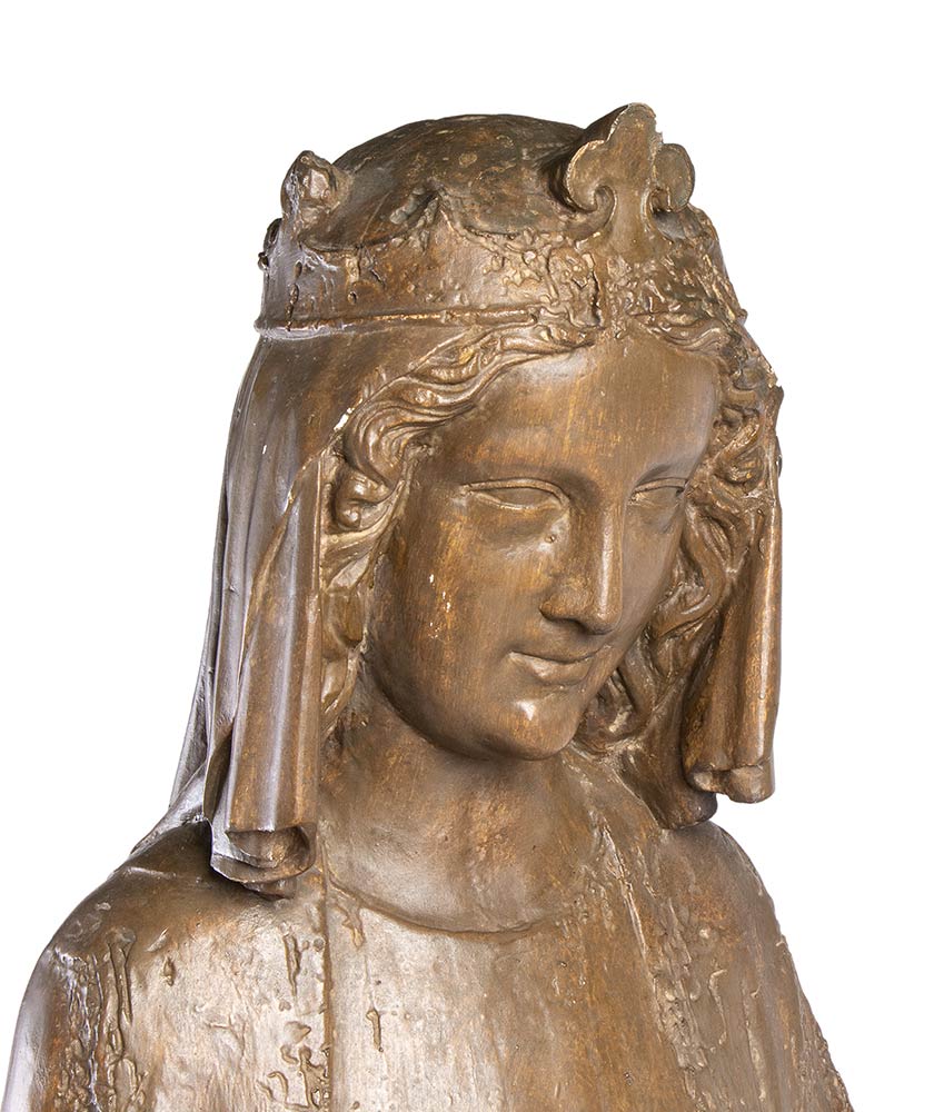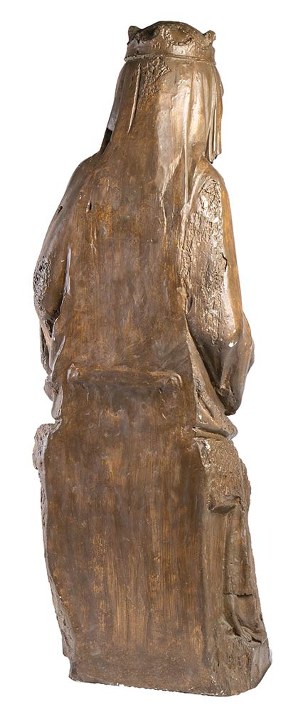 Firmata "Museo du Louvre Ateliers de Moulage", riproduzione statua madonna del’400. Dimensioni 106 x 35 x 27 cm. Stato di conservazione: *** discreto, mancanze.
