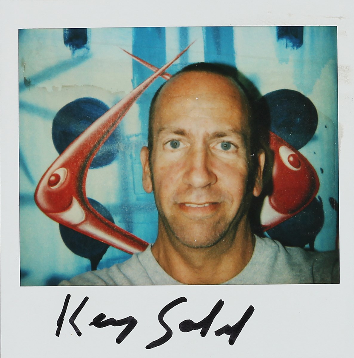 SCHARF KENNY (n. 1958) Autoritratto. Polaroid. Cm 10,00 x 10,50. Firma in basso a pennarello. Autoscatto realizzato e firmato direttamente dall'artista su polaroid in occasione della mostra itinerante Pulcherrimae Strade, tenutasi in Friuli Venezia Giulia dal 23 marzo fino al 30 giugno 2002. Autentica su fotografia.