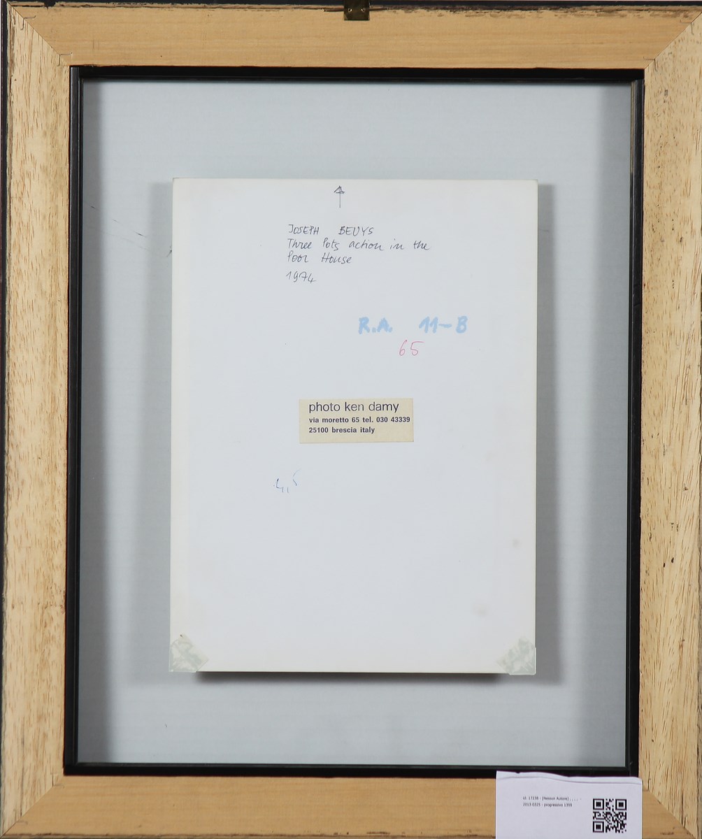 BEUYS JOSEPH (1921 - 1986) Three Pots Action in the Poor House. 1974. Fotografia. Cm 17,50 x 23,70. Al retro firma, titolo e data. Al retro cartiglio photo Ken Damy, Brescia. Cornice presente