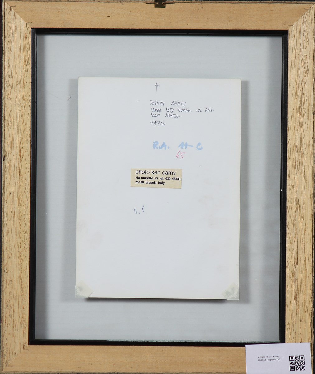 BEUYS JOSEPH (1921 - 1986) Three Pots Action in the Poor House. 1974. Fotografia. Cm 17,50 x 23,70. Al retro firma, titolo e data. Al retro cartiglio photo Ken Damy, Brescia. Cornice presente