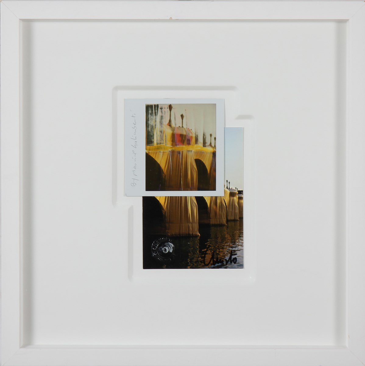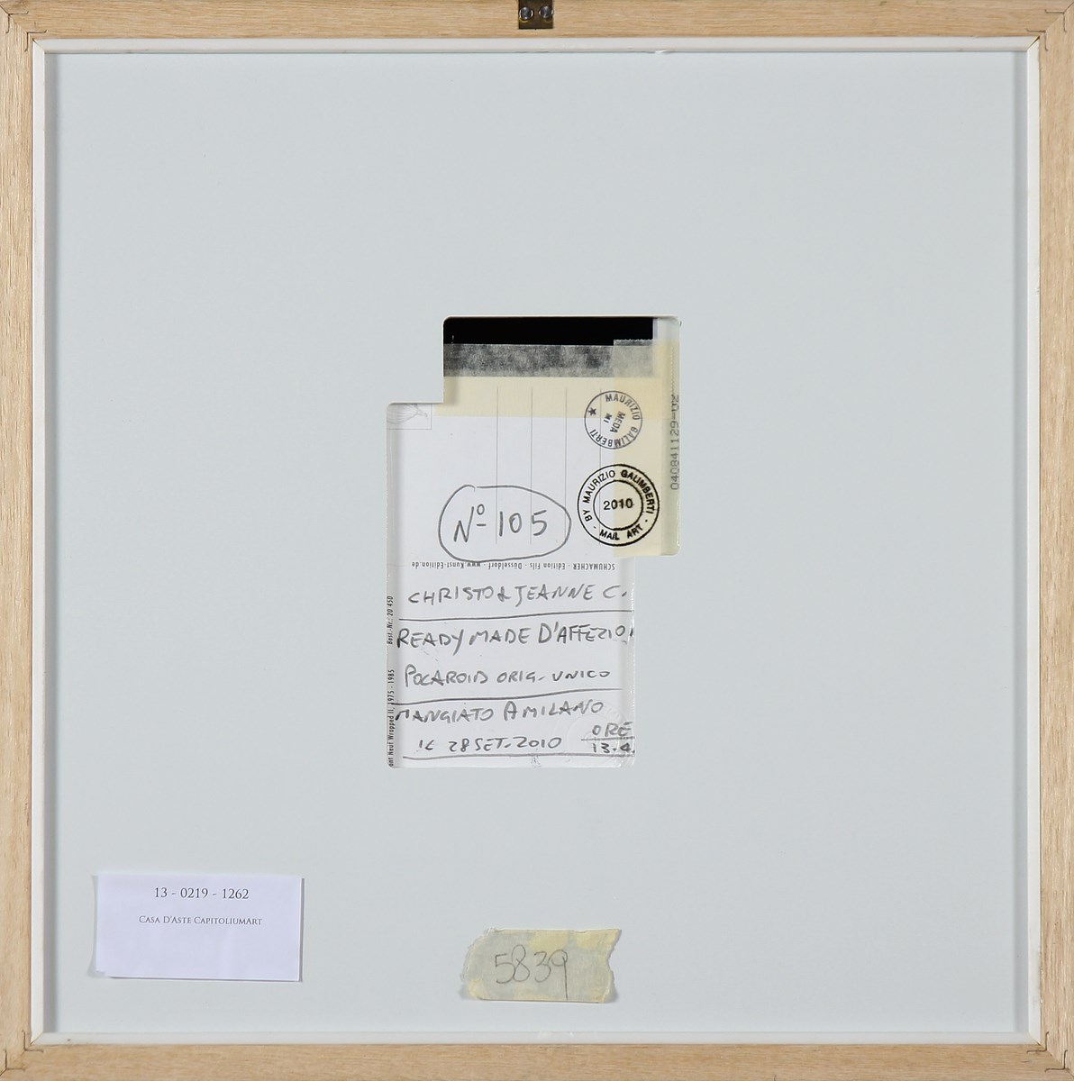 GALIMBERTI MAURIZIO (n. 1956) ChristoReadyMadeAffezione n.105 del 28.09.2010. 2010. Ready Made. Cm 12,30 x 17,60. Firmato Maurizio Galimberti in alto a destra. Firmato Christo in basso a destra. Timbro a secco Maurizio Galimberti in basso a sinistra. Al retro titolo, data e timbro Maurizio Galimberti mail art. Opera archiviata presso l'archivio Nordest, Seregno, come da documentazione fotografica allegata riportante il relativo numero d'archivio. Cornice presente