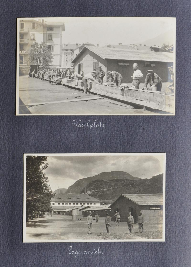 Anonym/Anonimo Album di fotografie "Andenken an den Weltkrieg, 1915/8;Etappenbezirkskommando Bozen", 1915-1918 91 fotografie con scritte: Kommando im Hotel Viktoria/ Bozen, Oberst Dante Bontardi, Oberstlt. Graf Friedrich Meraviglia, Hauptmann Karl Hippmann, Magazine, Desin fektionsbaracke, Schneiderei, Tischlerei, Friseurstube, Lager in Oberau, Wannenbad, Typen aus dem Gefangenenlager … Dimensioni album, 31,5 x 25 cm