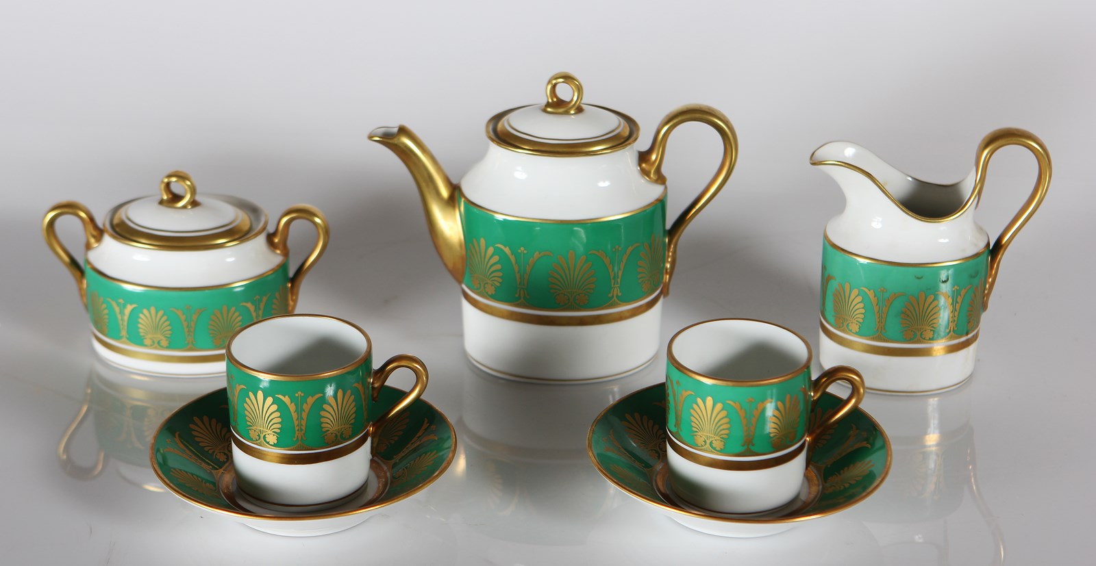 Servizio da caffè in porcellana Richard Ginori colorata di verde con decorazioni dorate. Porcellana. . Servizio composto da n. 2 tazzine con n.2 piattini, n.1 caffettiera, n. 1 lattiera e n.1 zuccheriera.