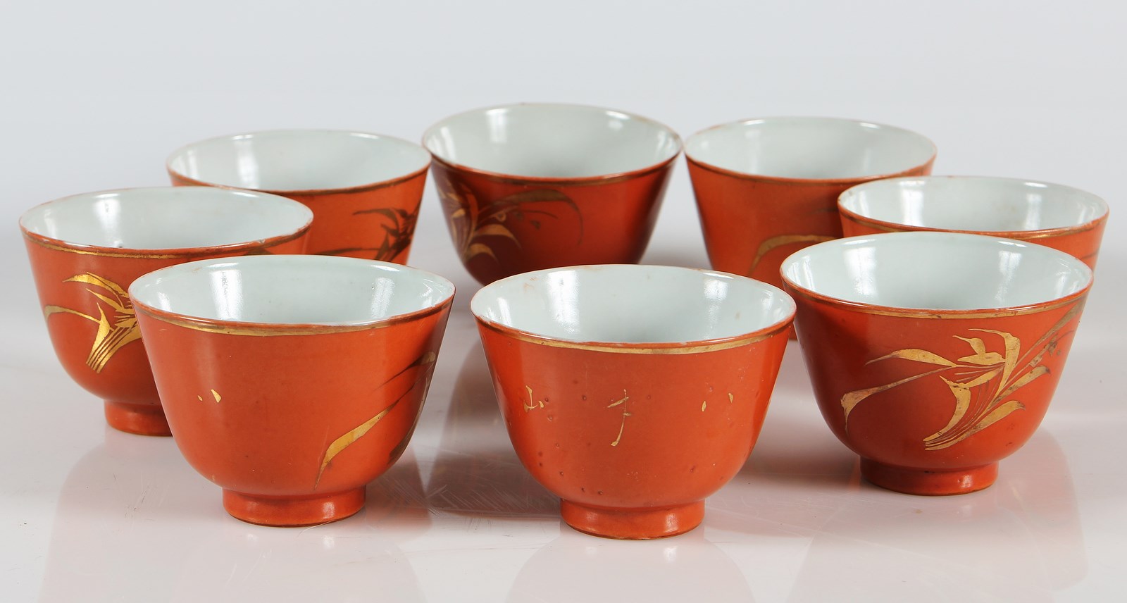 Lotto composto da n. 8 tazzine in porcellana bianca, con decorazioni orientali oro su fondo arancione. Porcellana. Cm 6,00. Serie Bambù. Diametro tazzina: 8,5 cm. Tazzine sprovviste di manico.