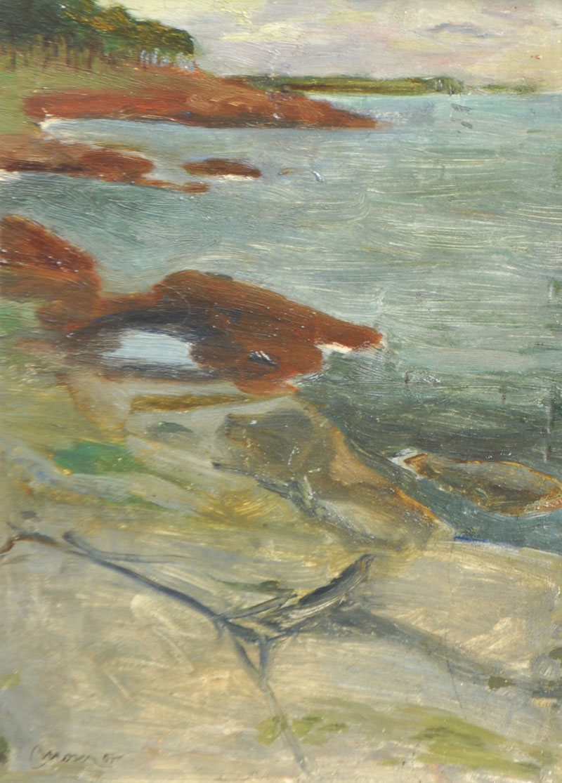 Carl Moser (Bozen/Bolzano 1873 – 1939) Costa marittima, 1907;Olio su cartone, 23,8 x 18,5 cm, in cornice