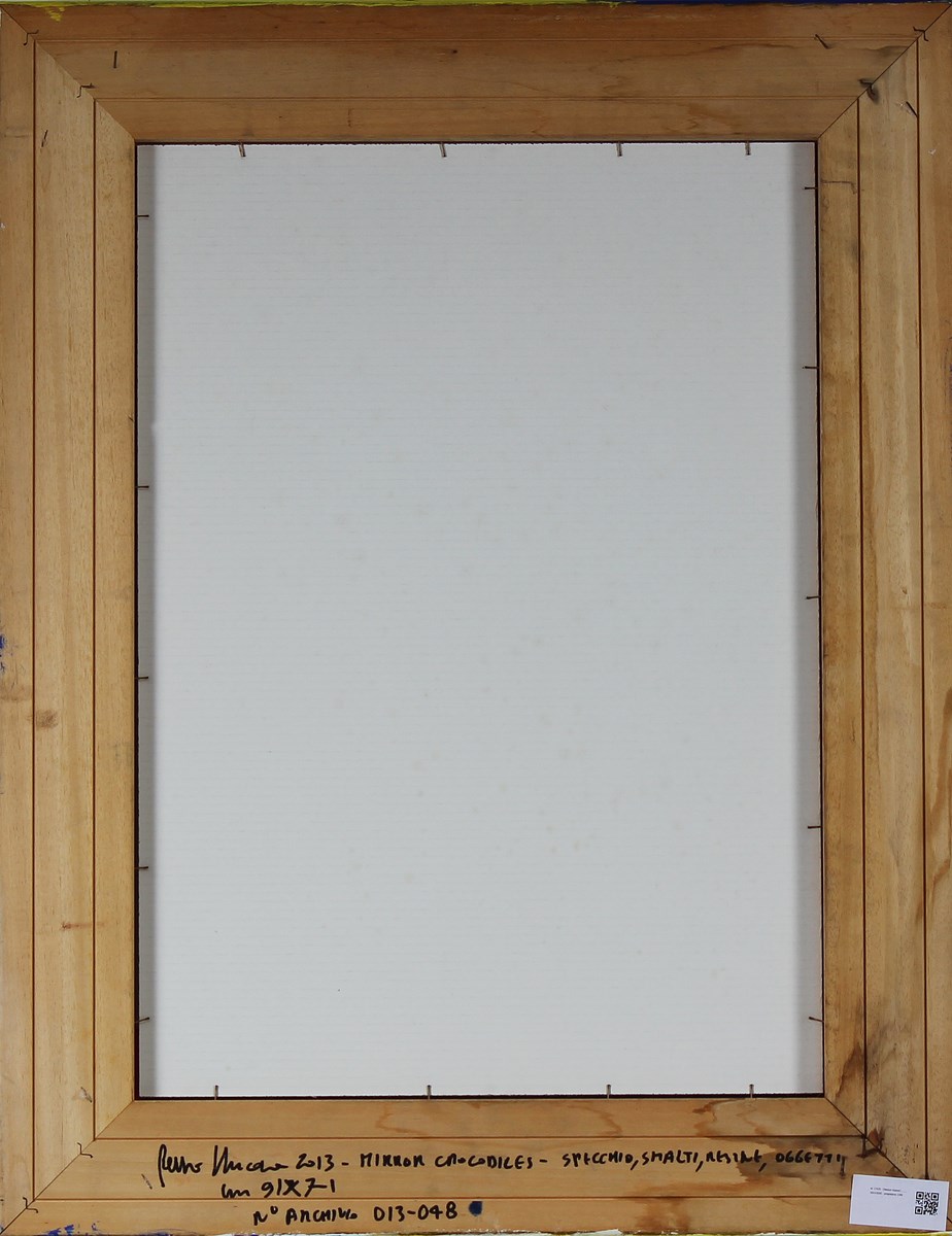NUCARA RENZO (n. 1955) Mirror Crocodiles. 2013. Specchio, acrilico, smalti, resine, oggetti. Cm 49,00 x 69,00. Al retro firma, titolo e data. Autentica dell'artista su fotografia riportante il relativo numero d'archivio. . Cornice presente