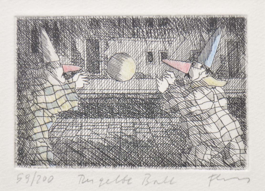 Paul Flora (Glurns/Glorenza 1922 – Innsbruck 2003) Il pallone giallo;Acquaforte colorata a mano, 5,8 x 9 cm (lastra), in cornice