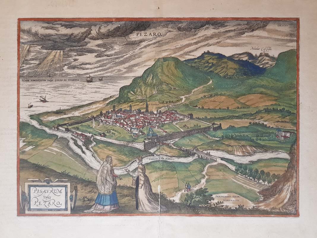 Georg Braun / Franz Hogenberg Pesaro, 1580 ca;da: Civitates orbis terrarvm, Incisione su rame colorata, ca. 30,5 x 46 cm , in cornice