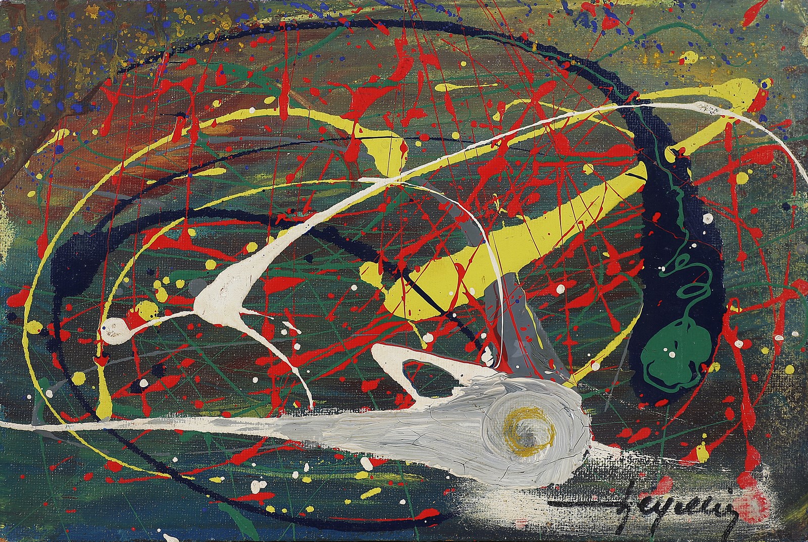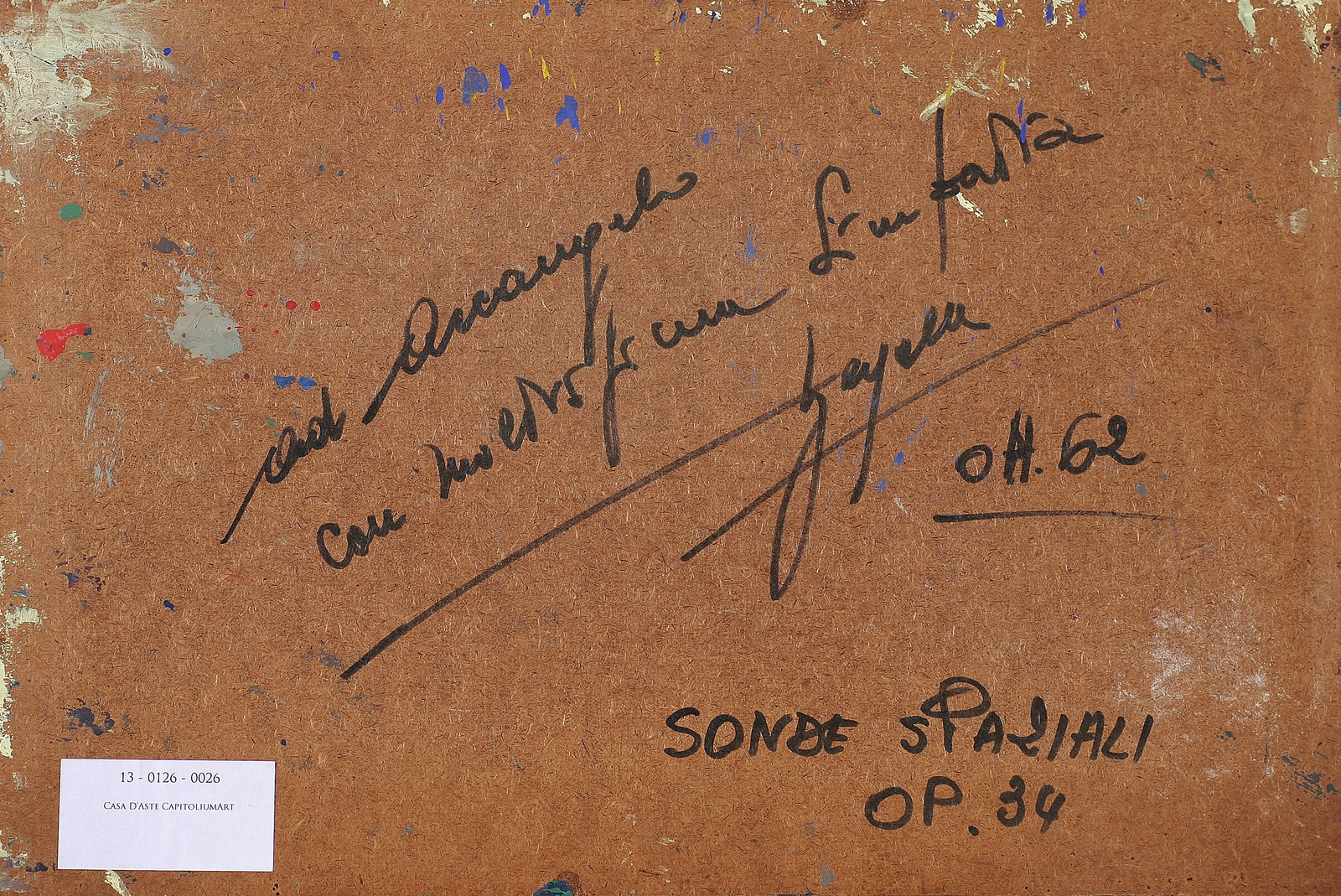 ANONIMO Sonde spaziali. Tecnica mista su faesite. Cm 45,00 x 30,00. Firma illeggibile in basso. Al retro firma illeggibile, dedica e titolo.