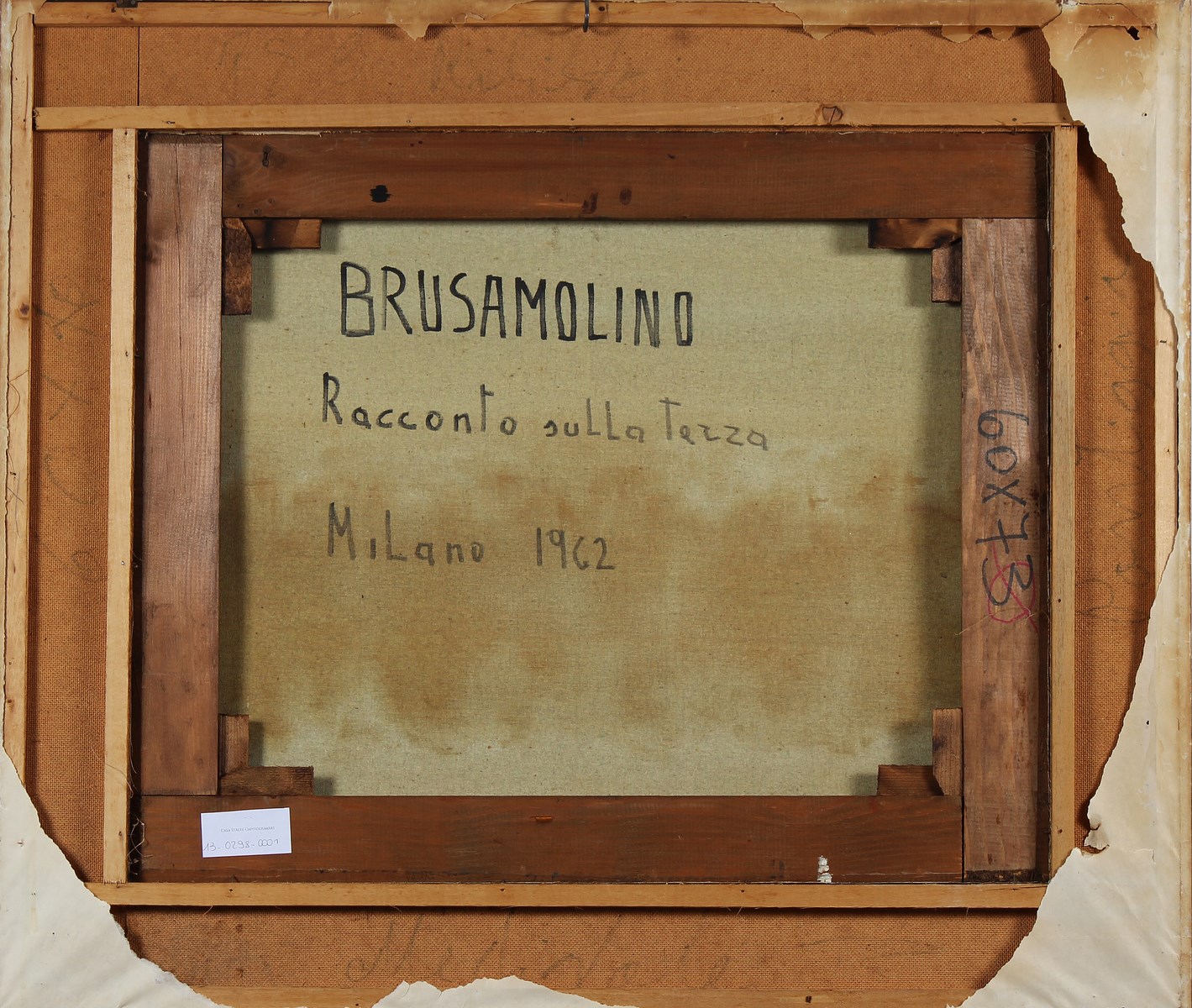 BRUSAMOLINO GIANNI (n. 1928) Racconto sulla terra. 1963. Olio su tela . Cm 73,00 x 60,00 x 4,50. Firma e data in basso a sinistra. Al retro firma, titolo e data. Cornice presente