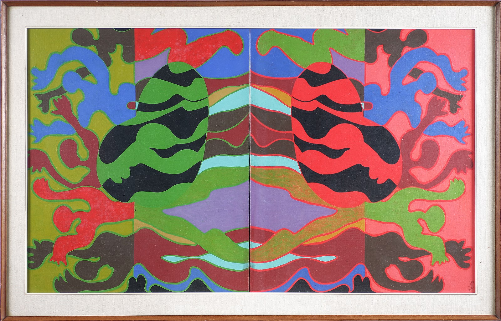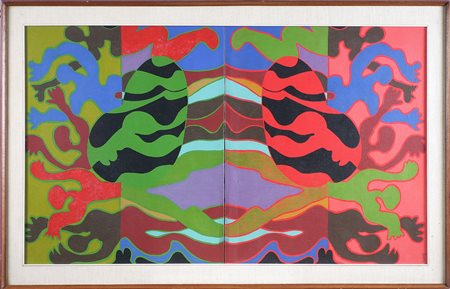 PACHECO JULIAN (n. 1937) Fiesta. 1968. Acrilico su tela. Cm 59,50 x 101,00. Firma e anno in basso a sinistra. opera suddivisa in n.2 tele. Cornice presente