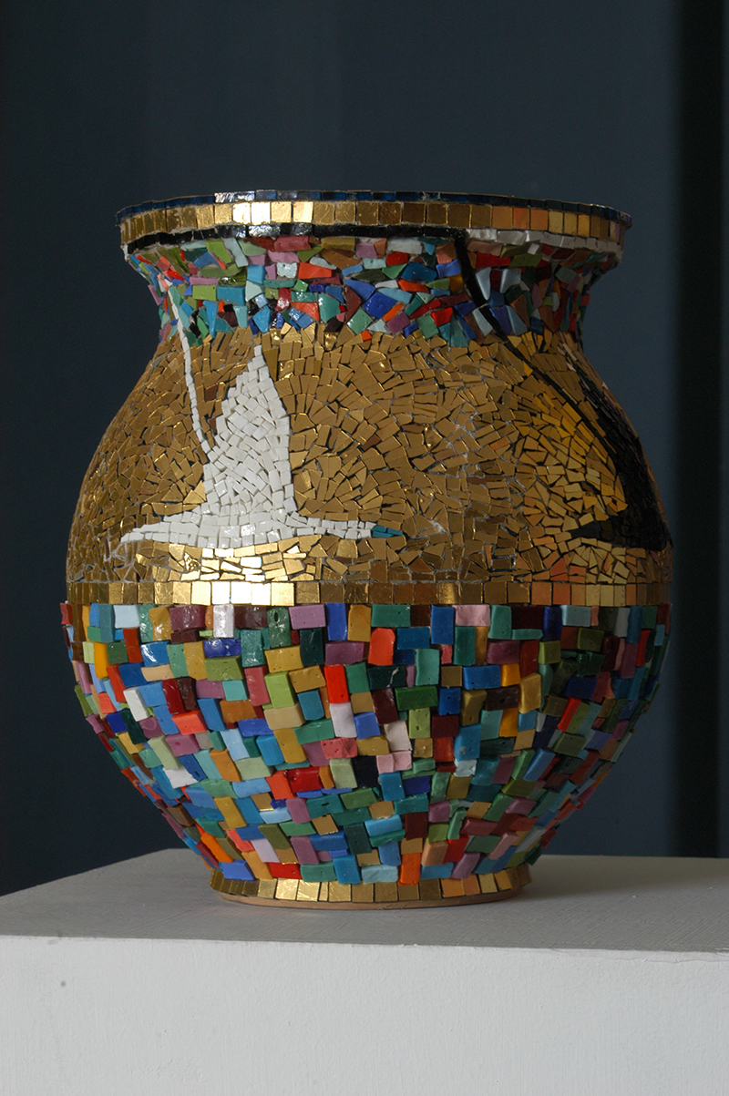 Vaso di terracotta rivestito di mosaico policromo, smalto vetroso e oro