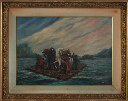 ORNAGHI F. (n. 1930) La traversata del fiume. Olio su tela . Cm 70,00 x 50,00. Firma in basso a sinistra. Cornice presente