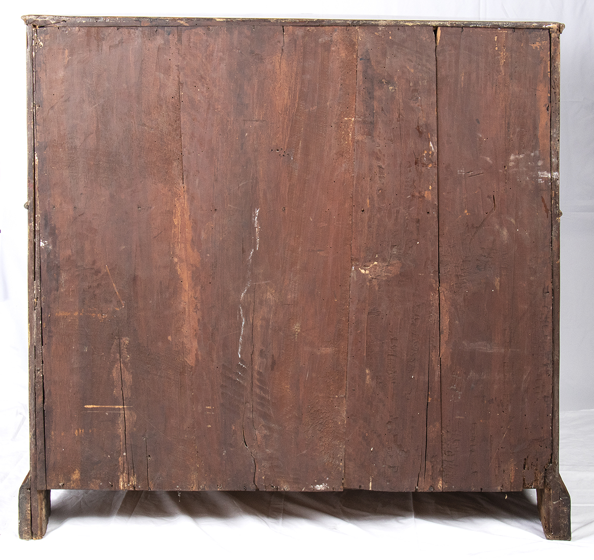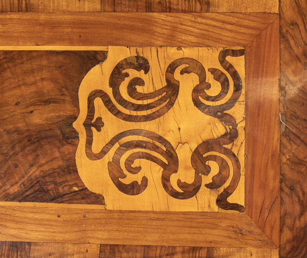 in legno noce intarsiata a motivi floreali in legno di bosso. Area bassa Lombardia-alta Emilia. Dimensioni 109 x 111 x 57 cm. Stato di conservazione: **** buono.