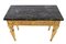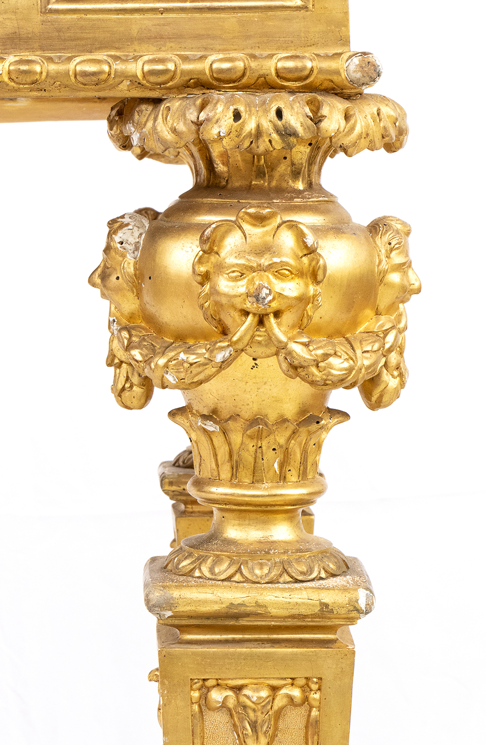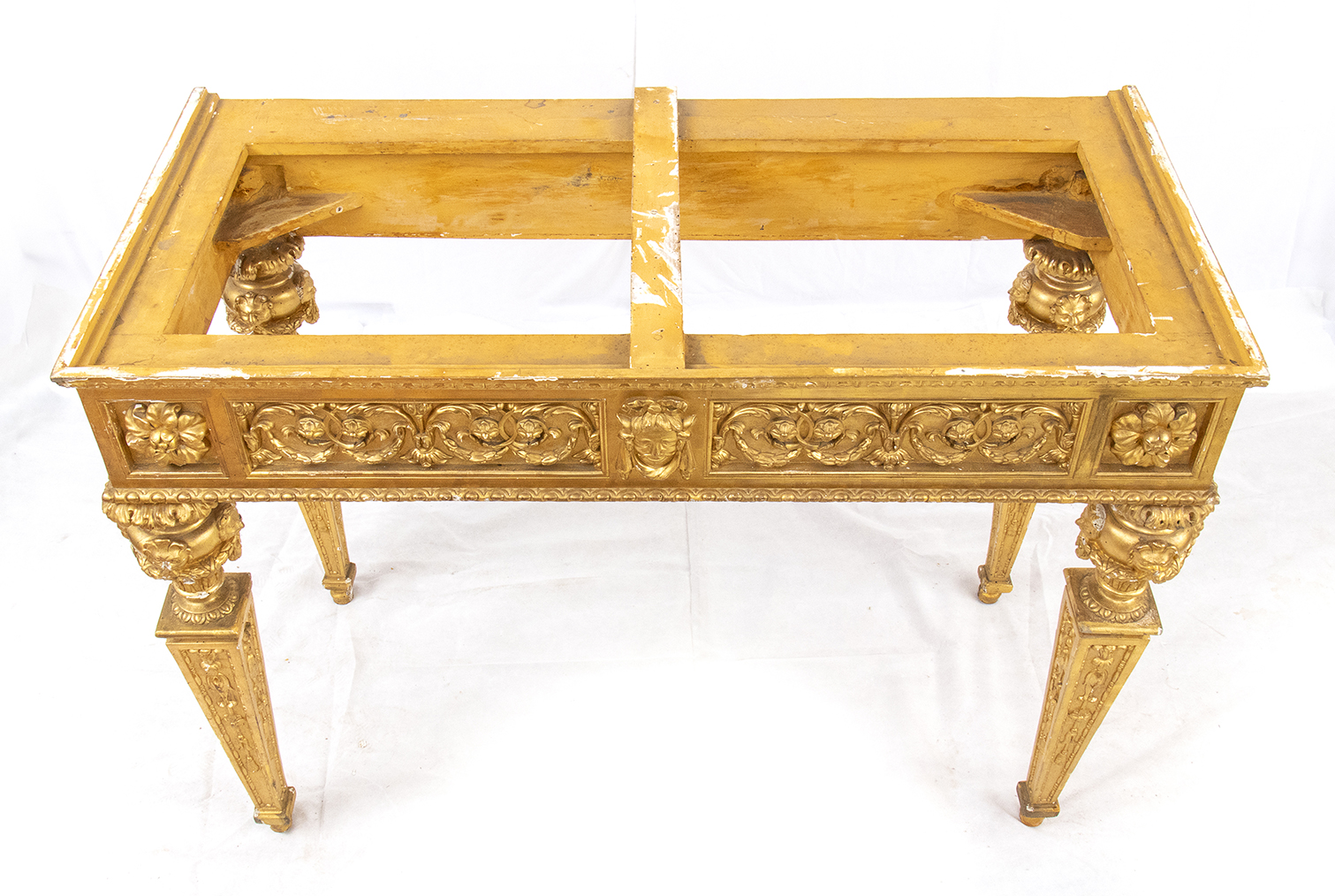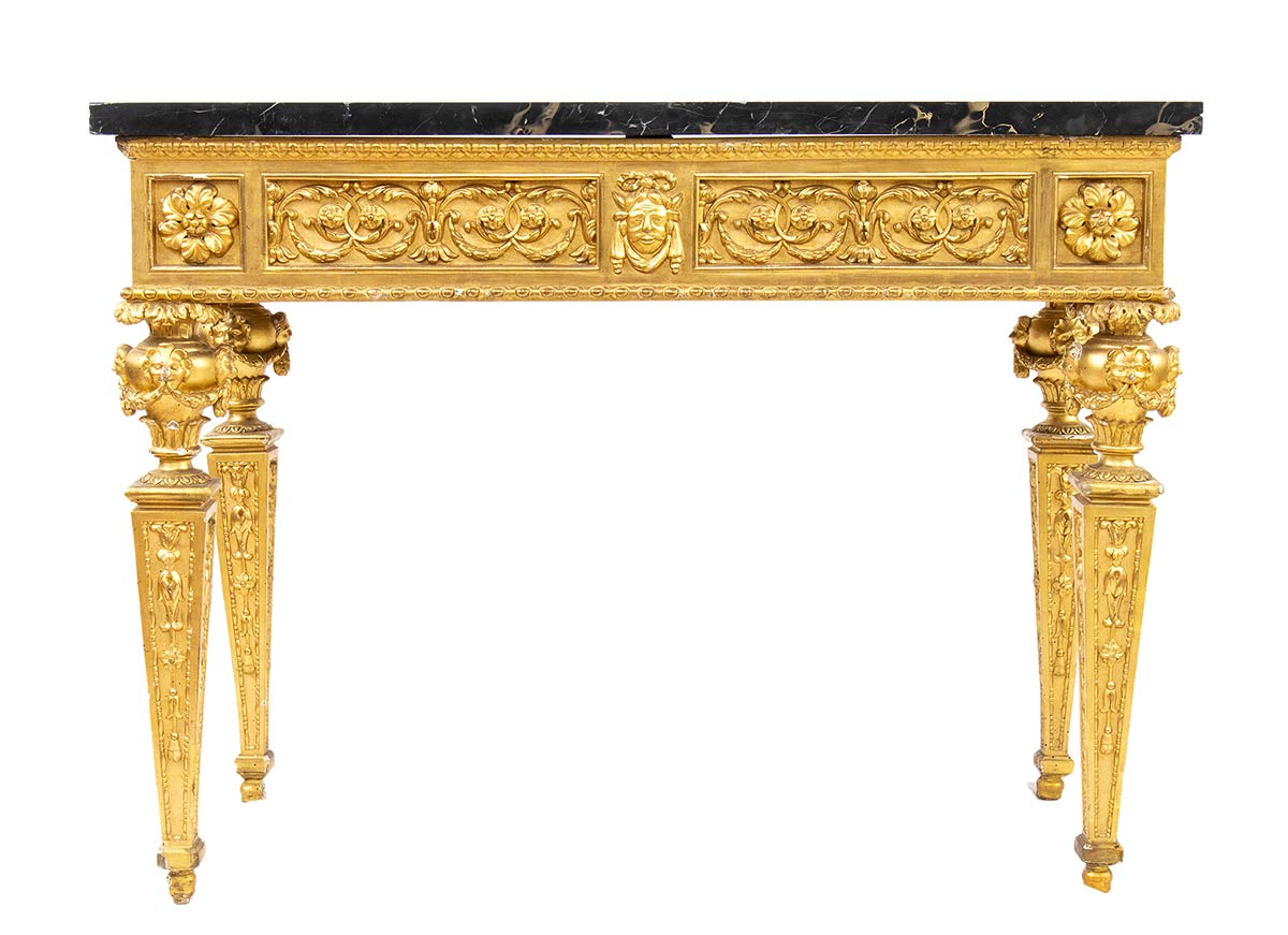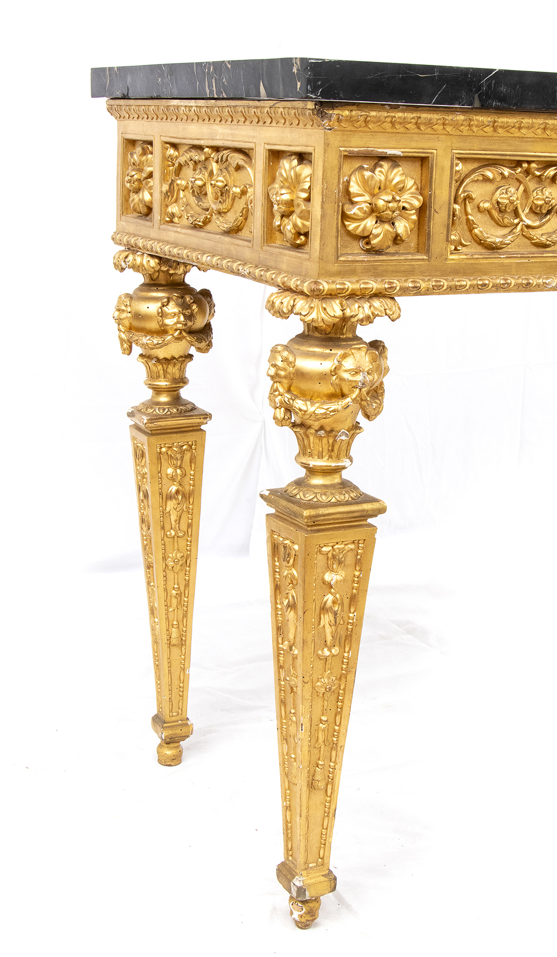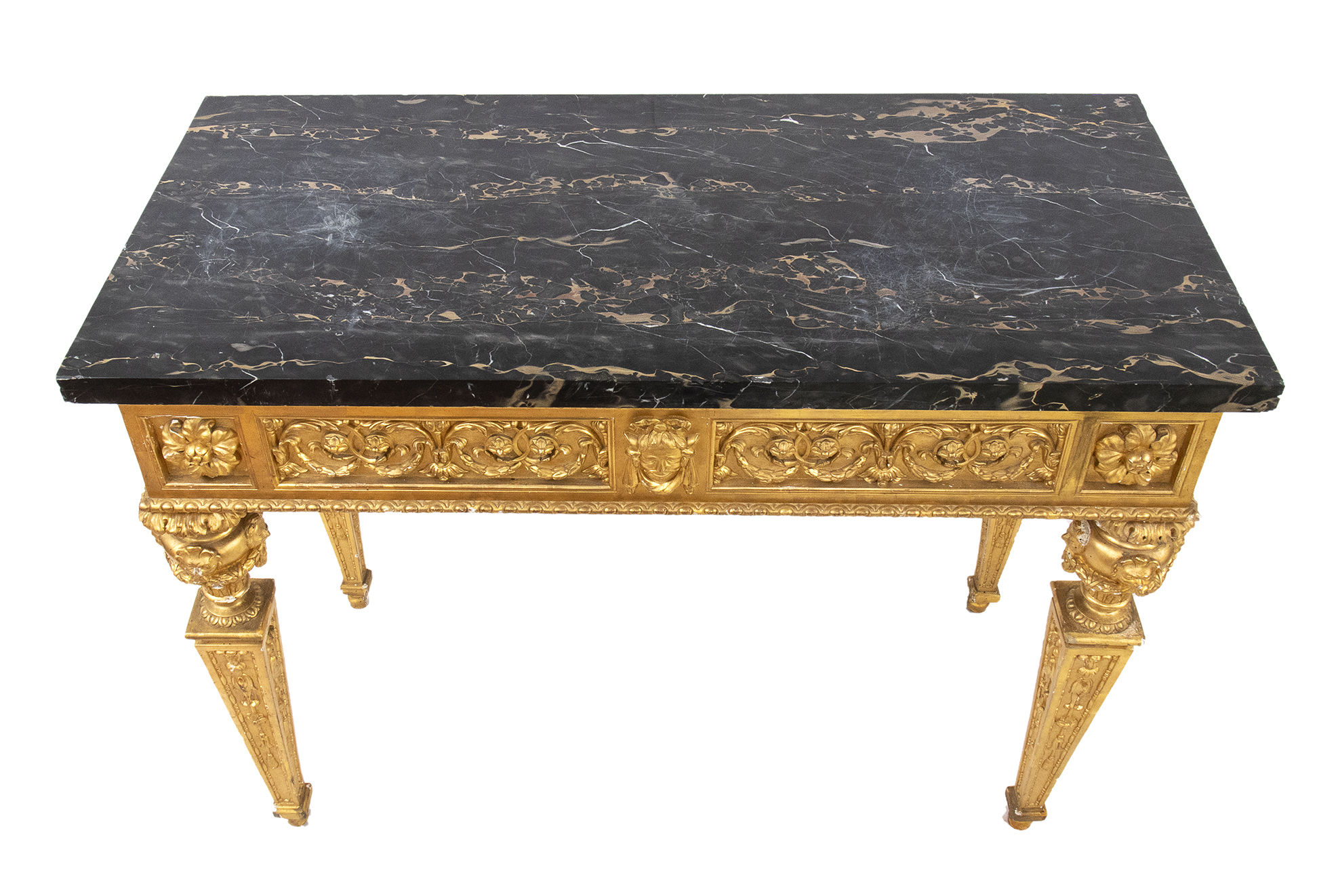 gamba tronco piramidale, finemente intagliata con mascherone centrale. Piano marmo Portoro coevo, spessore 4 cm. Doratura originale. Dimensioni 105 x 139,5 x 66,5 cm. Stato di conservazione: *** discreto, difetti.