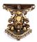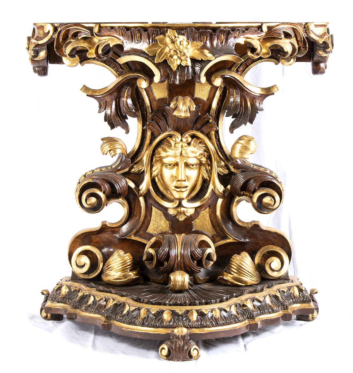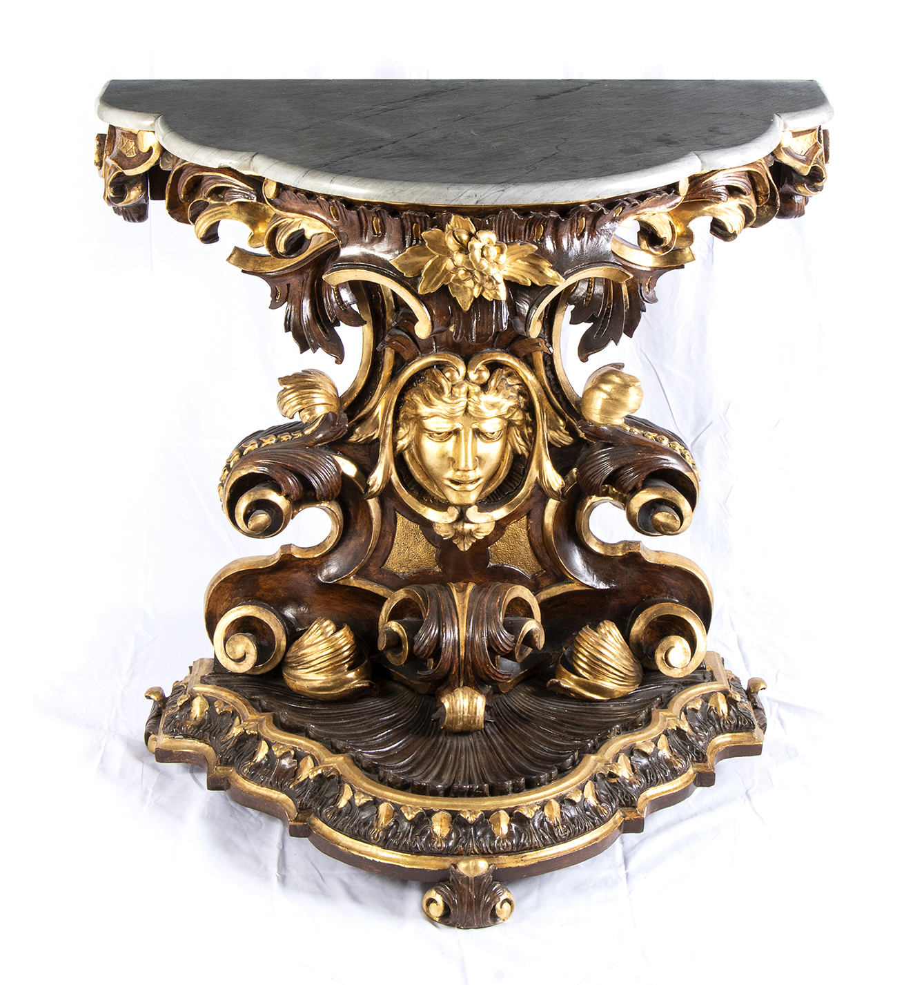 rara consolle Romana finemente intagliata, con mascherone centrale e applicazioni dorate. Piano in marmo grigio bardiglio coevo. Dimensioni 103 x 100 x 57 cm. Stato di conservazione: **** buono.