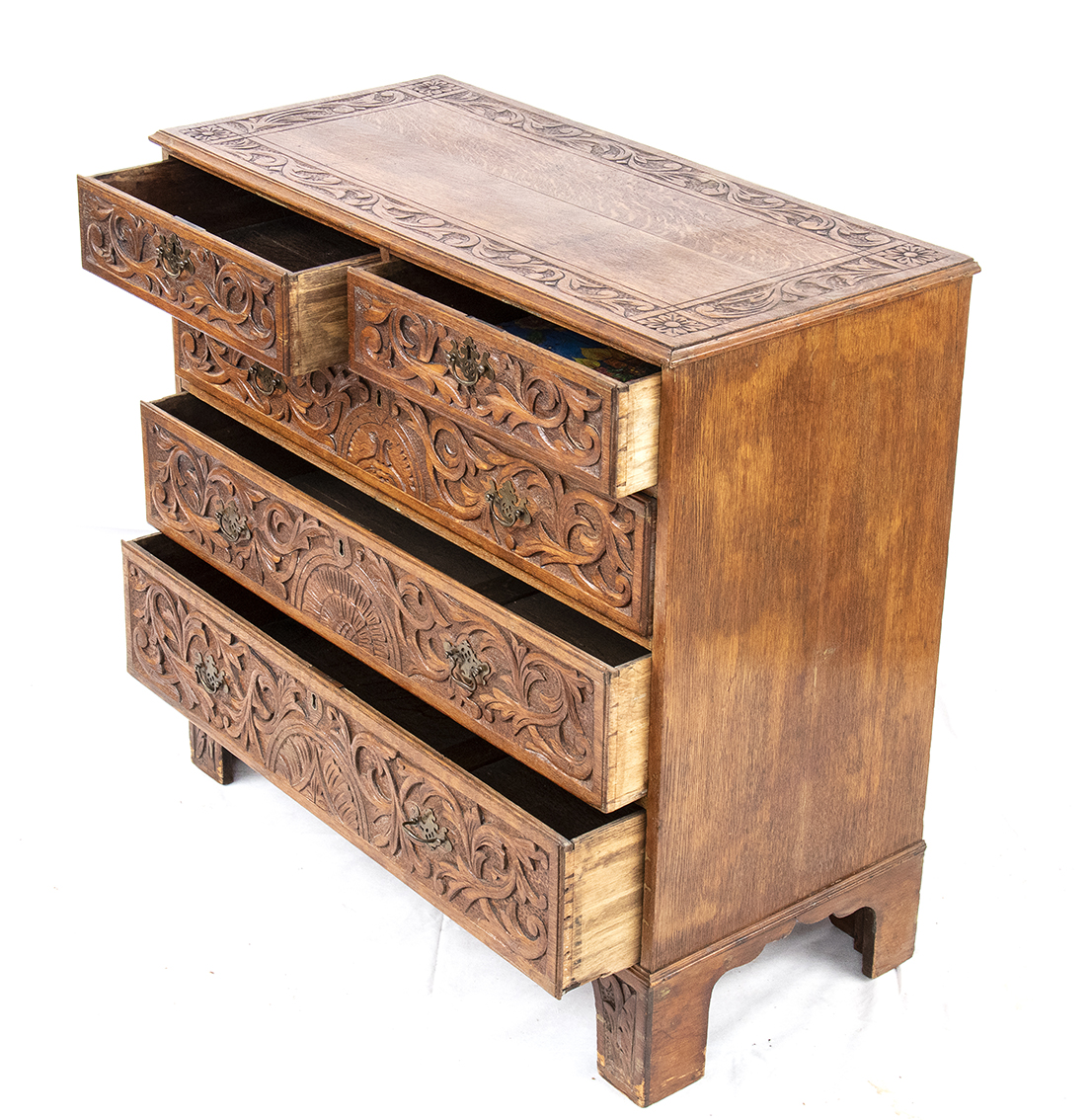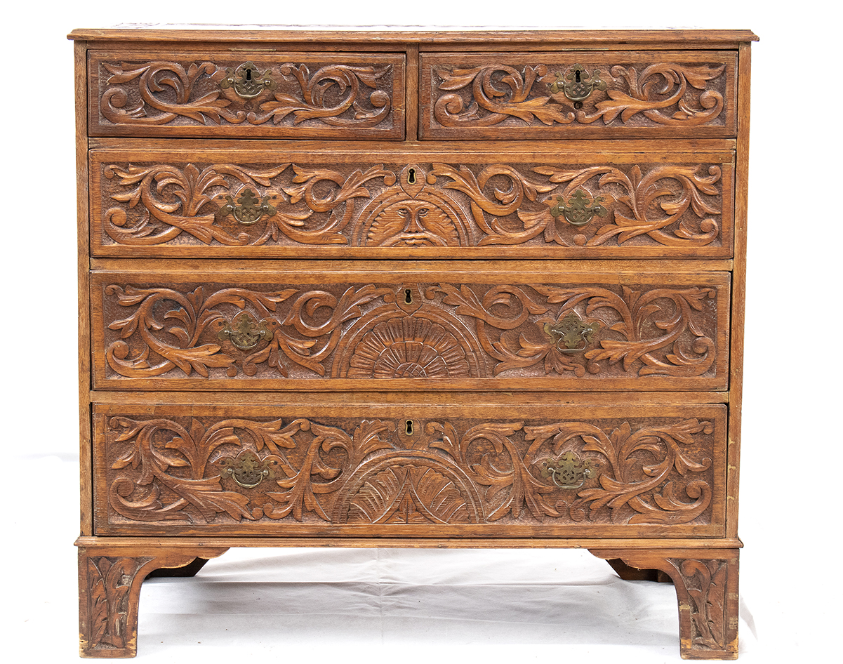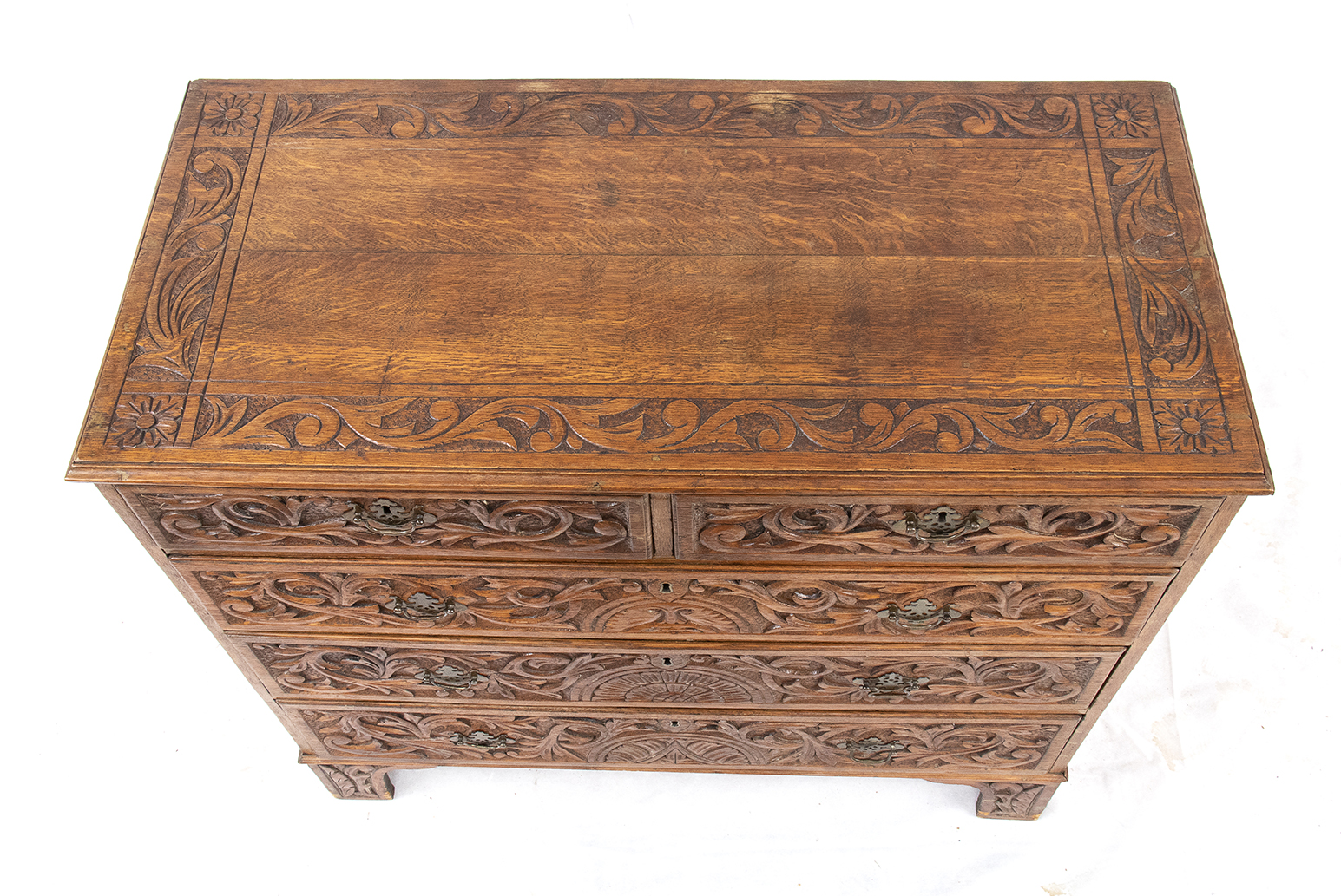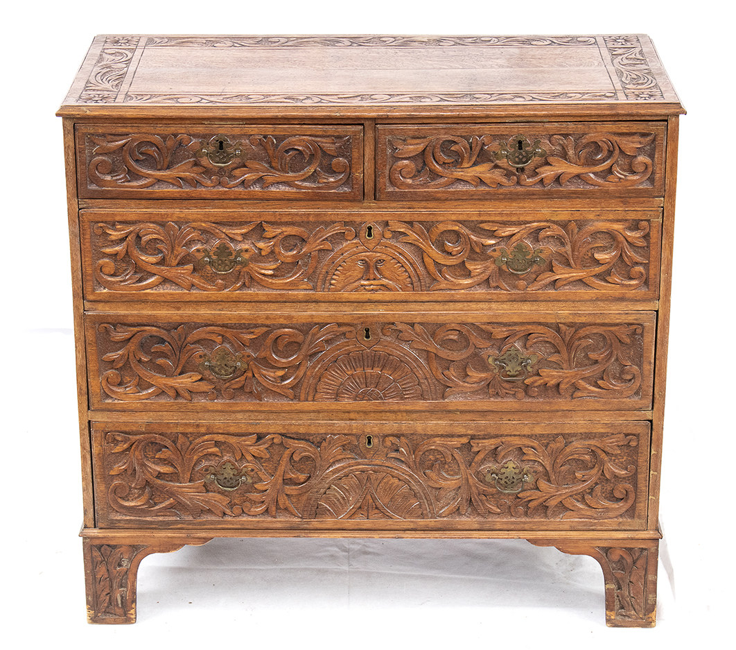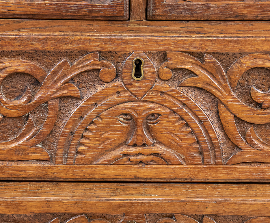 a tre cassetti con due cassetti superiori più piccoli, intagliato a motivi floreali con mascherone. Piedi a mensola. Dimensioni 102 x 108 x 50 cm. Stato di conservazione: **** buono.