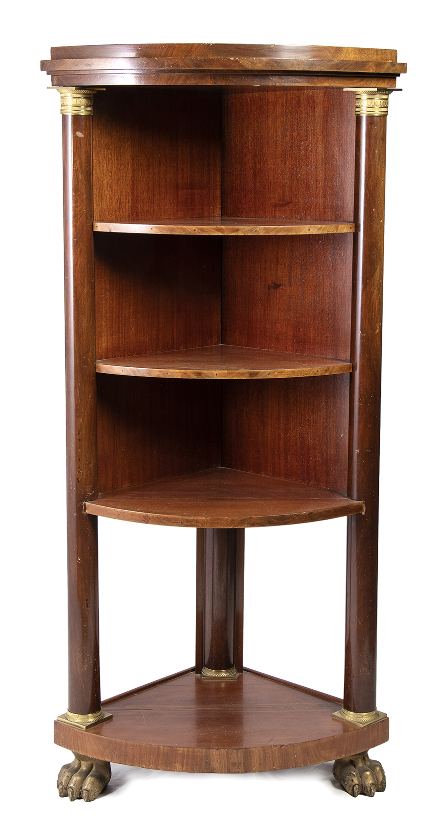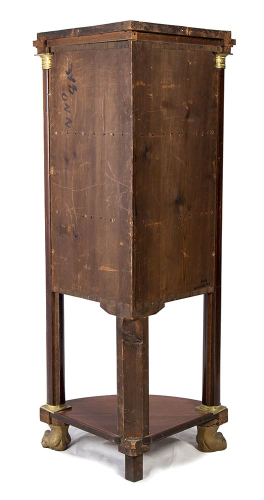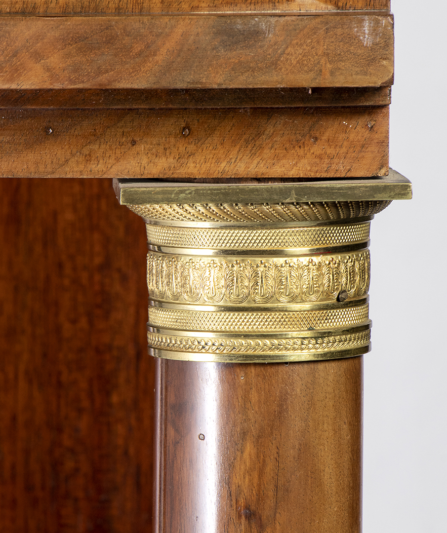 in legno di mogano, le colonne a vista si rifanno al periodo Impero sono arricchite con bronzi, i piedi leonini sono in legno intagliato e dorato. Dimensioni: 145 x 68 x angolo 45 cm. Stato di conservazione: *** discreto.