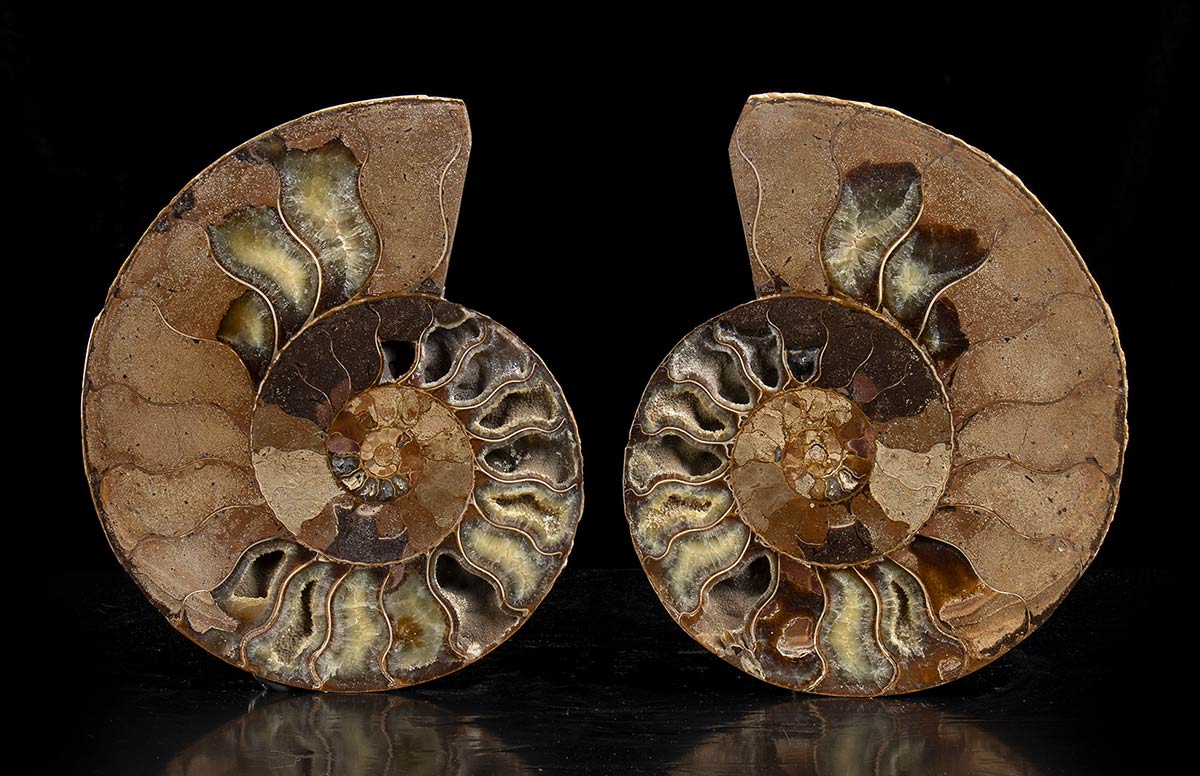 Ammonite iridescente fossile perfettamente sezionata per mostrare la spirale e i cristalli interni. Diametro 20 cm. Diametro 18 cm.