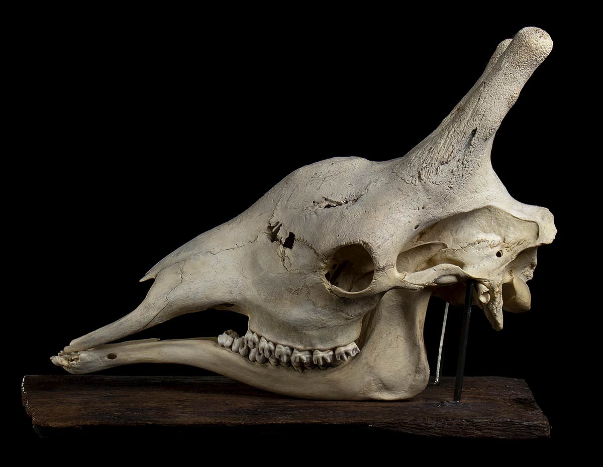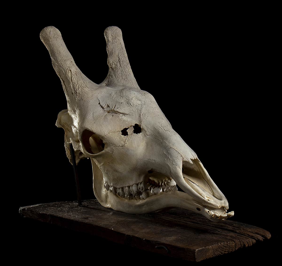 Teschio di giraffa di maschio adulto di eccezionale dimensione con base in legno completa di supporto. Dimensioni 78 x 56 cm.