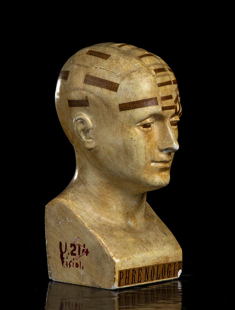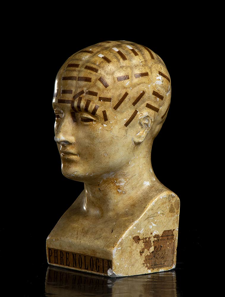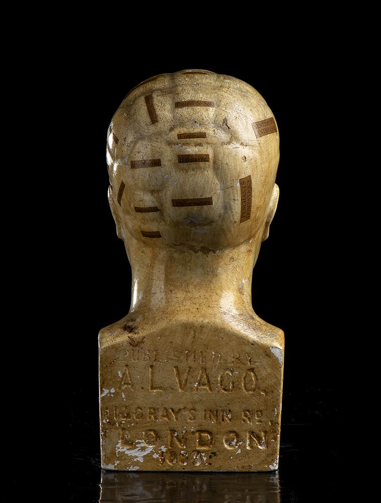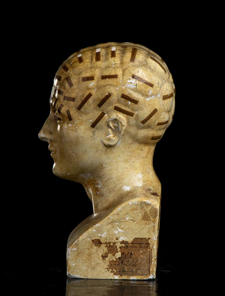 Busto frenologico didattico in gesso con varie etichette e diciture di collezione. Provenienza Università di Pavia e prodotto a Londra nel 1883. Inghilterra, XIX secolo. Dimensioni: 23x12x 15cm