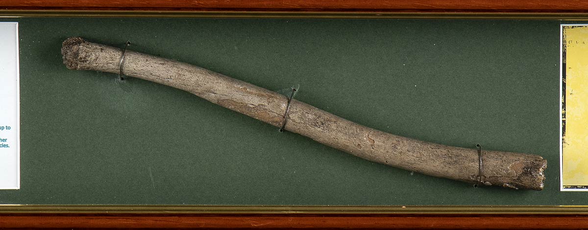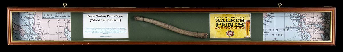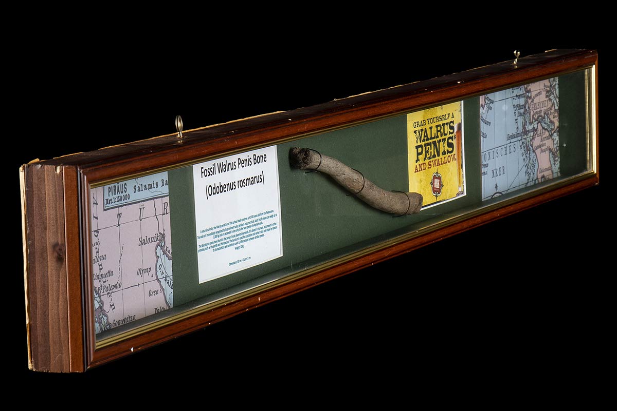 Pene di tricheco o Baculum fossile all'interno di una vetrina decorativa in legno che probabilmente faceva parte di un vecchio locale inglese poiché arricchita da mappe e didascalie sui generis. Dimensioni: 135 cm x 16 cm.