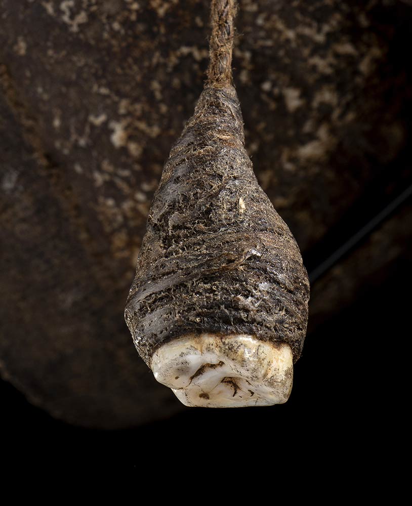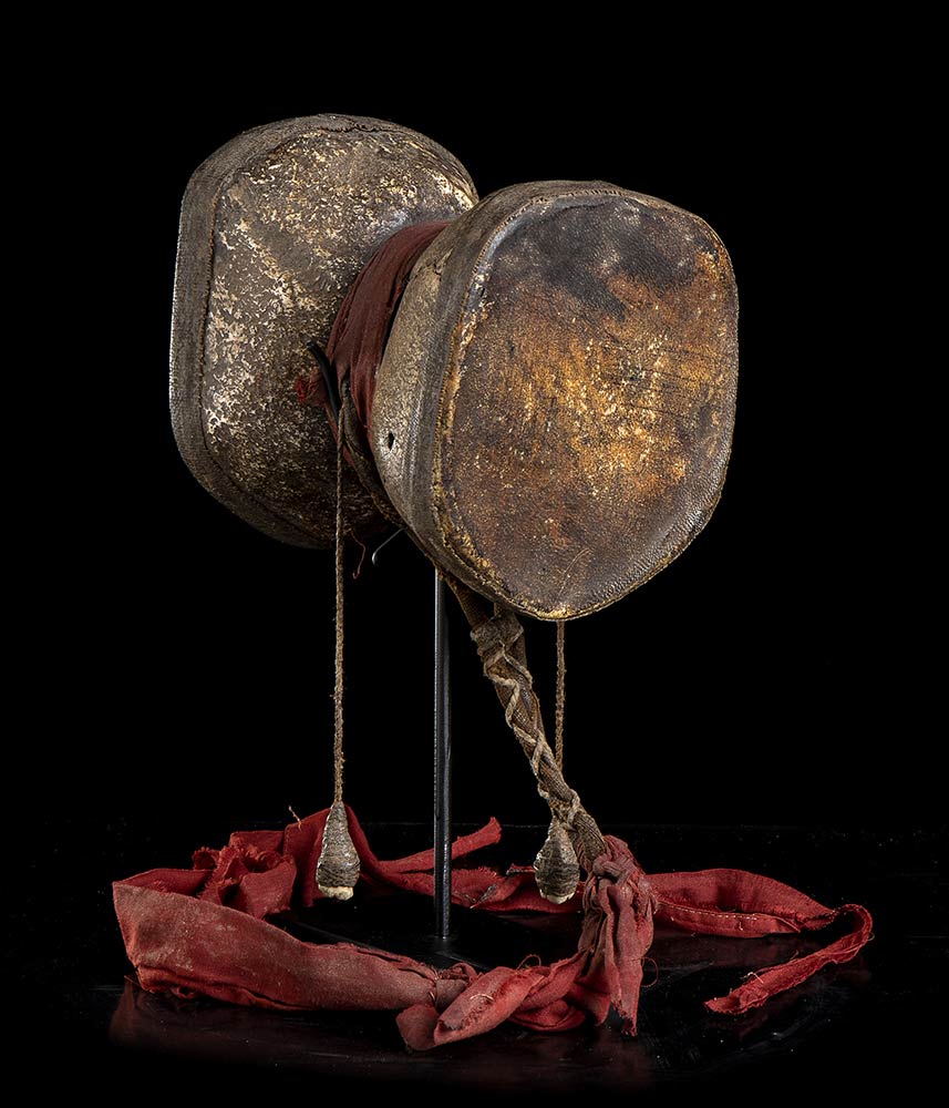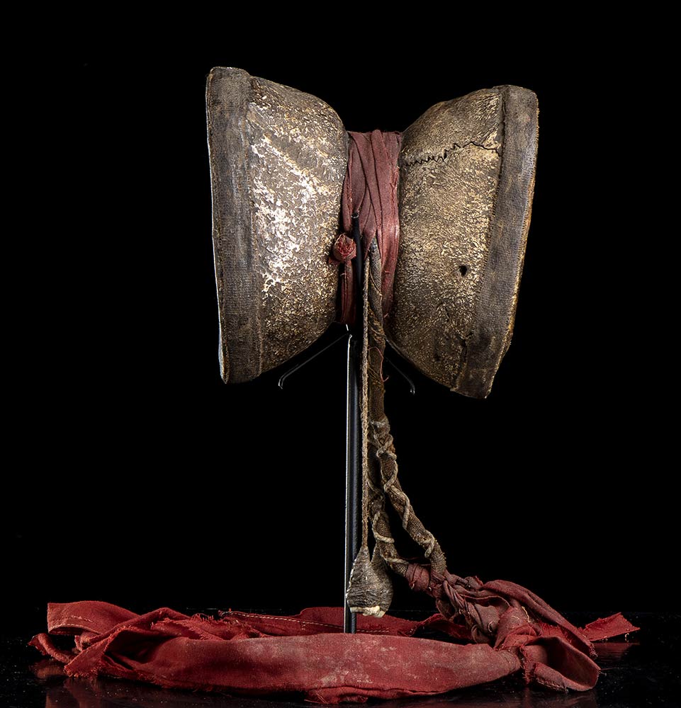 Il Damaru è un piccolo tamburo ricavato da due calotte craniche umane e usato all'interno dei riti tibetani Chöd. A differenza di molti altri questo è un esemplare autentico paragonabile allo stesso contenuto all'interno della famosa collezione di André Breton. Ex collezione Giuseppe Tucci. XVII secolo. Altezza con piedistallo: 30 cm. Lotto visibile su prenotazione a Londra
