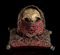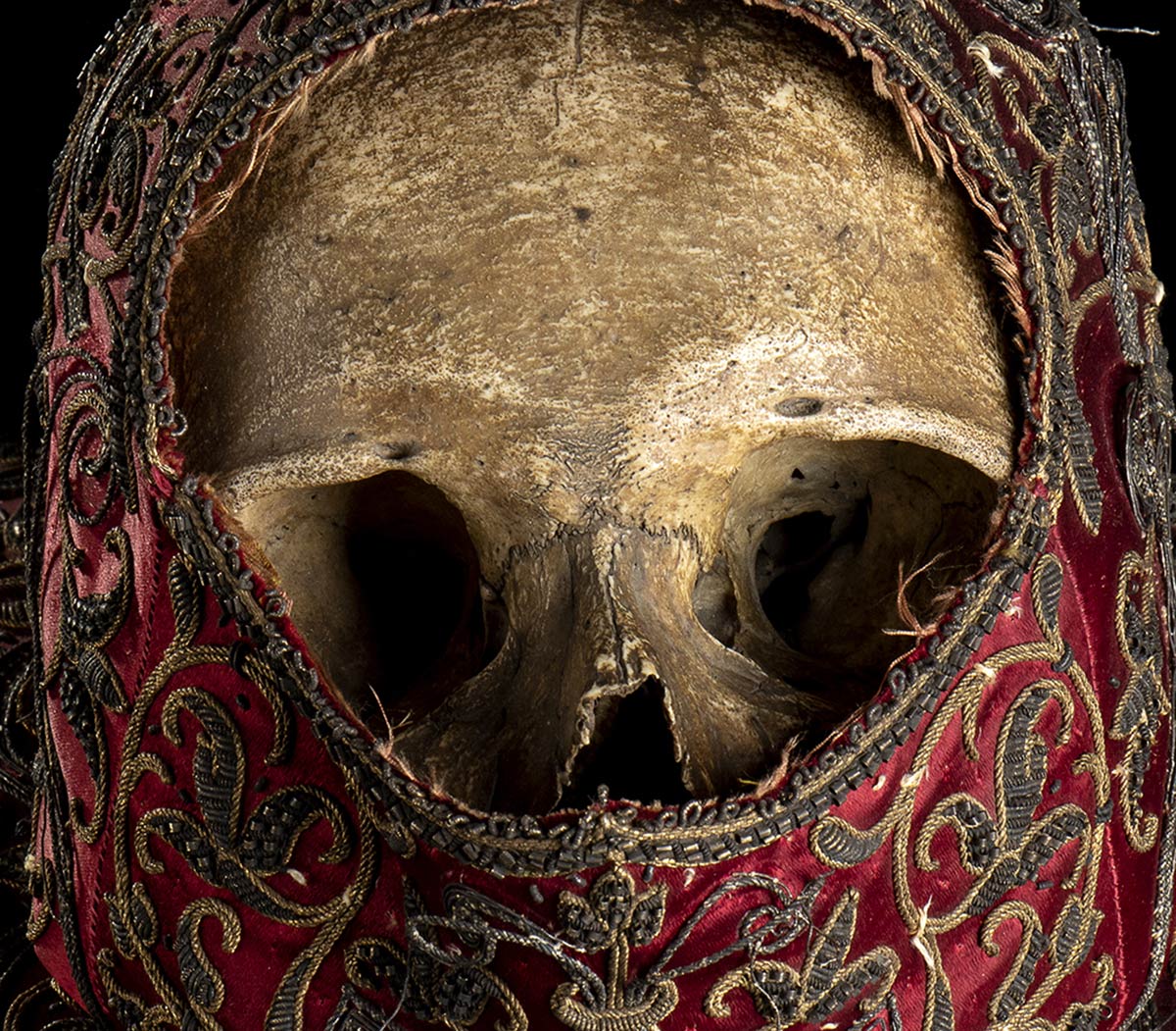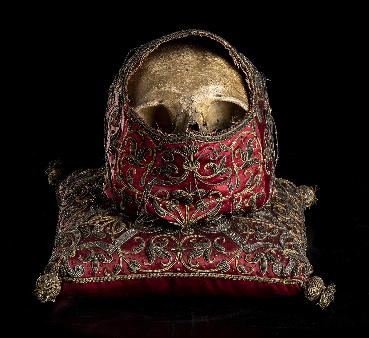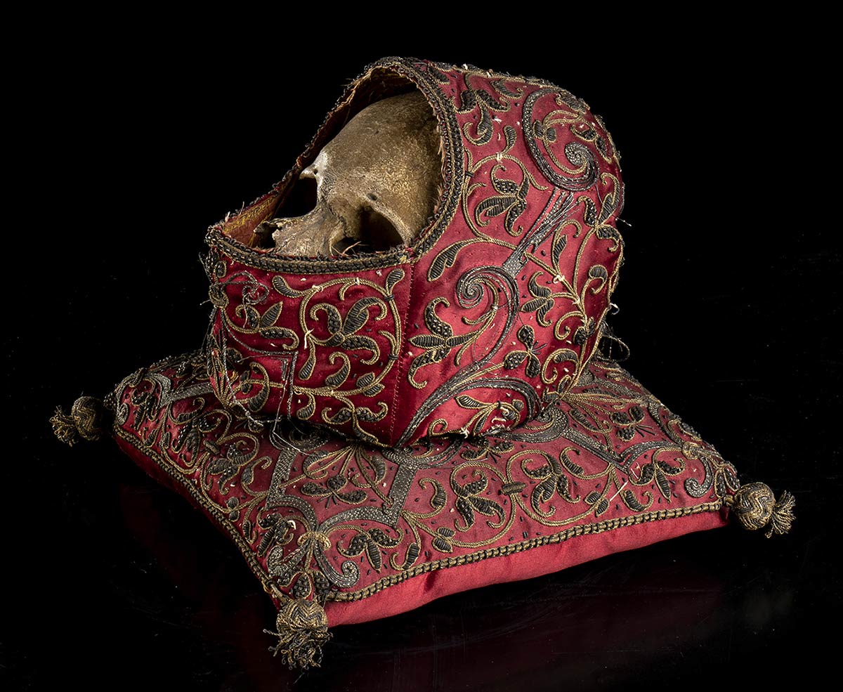 Vero teschio medievale o rinascimentale custodito all'interno di un favoloso cappuccio ricamato a mano con filo d'oro e d'argento. Il teschio incappucciato si poggia su un bellissimo cuscino con lo stesso stile e materiali. Databile tra il XIV e XVII Secolo. Ha una provenienza incerta poichè potrebbe essere un martire, eroe / cavaliere o aristocratico. Accompagnato da un documento di eredità. Lotto visibile su prenotazione a Londra