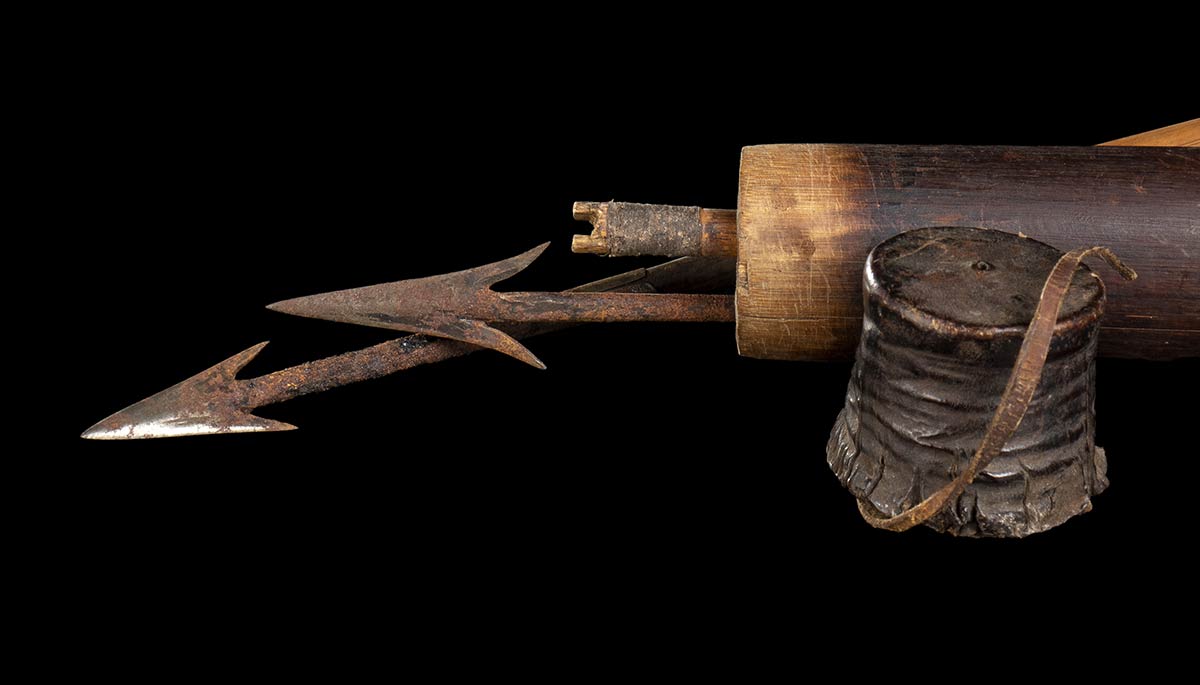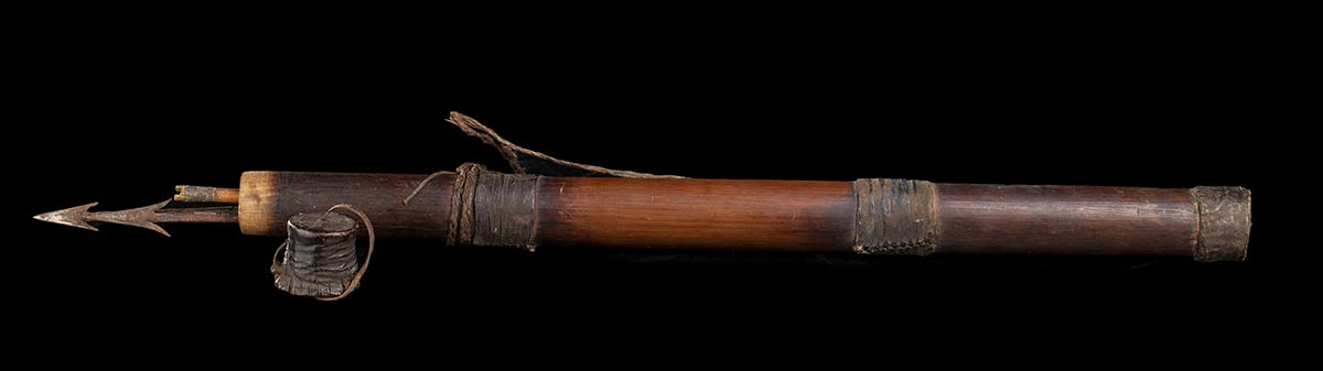 Faretra autentica dall'Africa centrale con tre frecce perfettamente conservate, metà XIX Secolo. Dimensioni 70 cm. In più è presente un arco con dei motivi a zig zag incisi sul manico. Inizi XX Secolo. Dimensioni 140 cm.