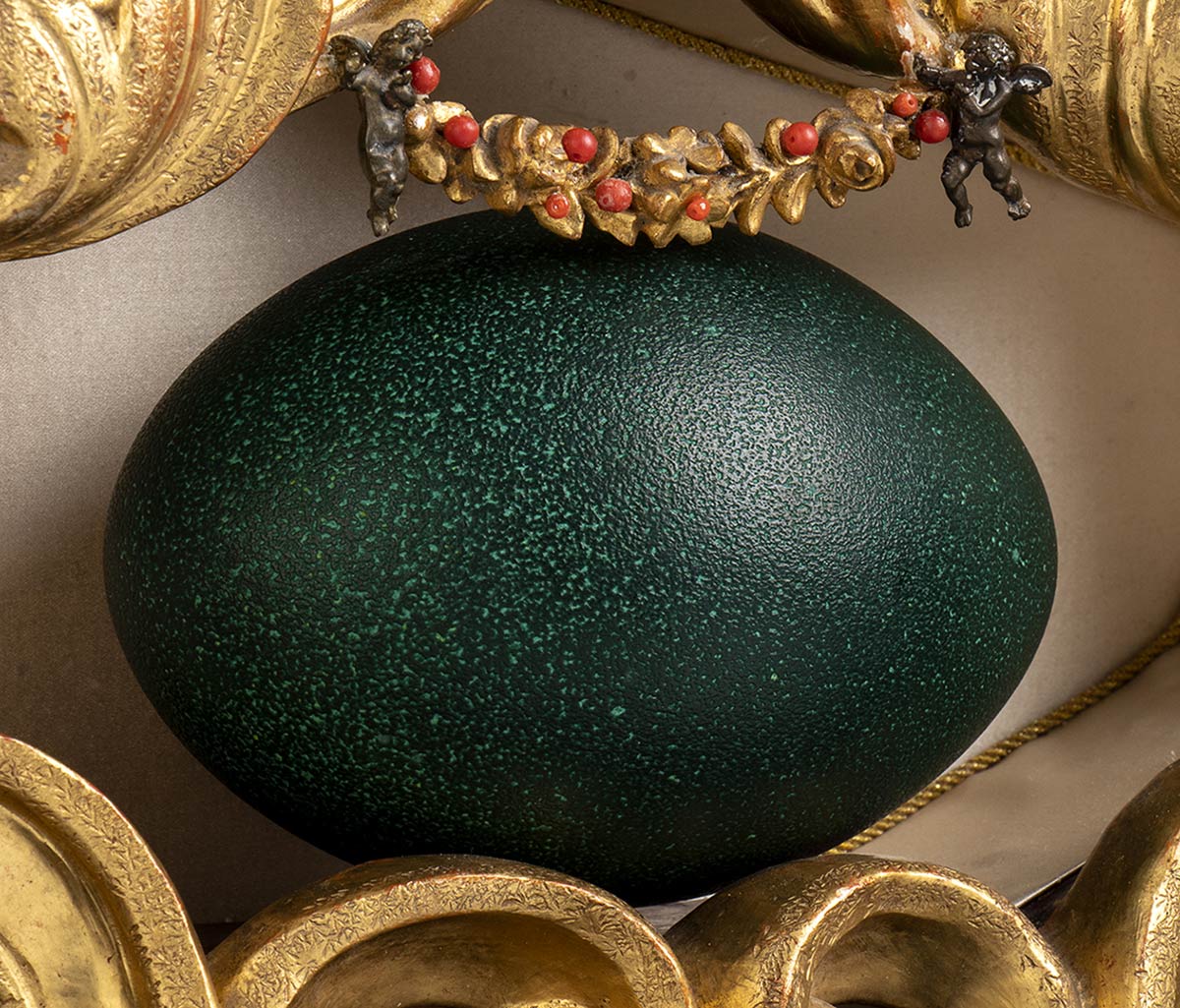 Bell'uovo di emu (Dromaius novaehollandiae) all'interno di una graziosa teca del '700. Italia, XVIII secolo. Dimensioni con teca 37 x 25 x 15 cm