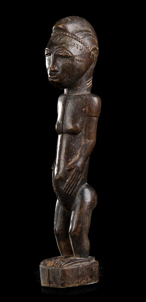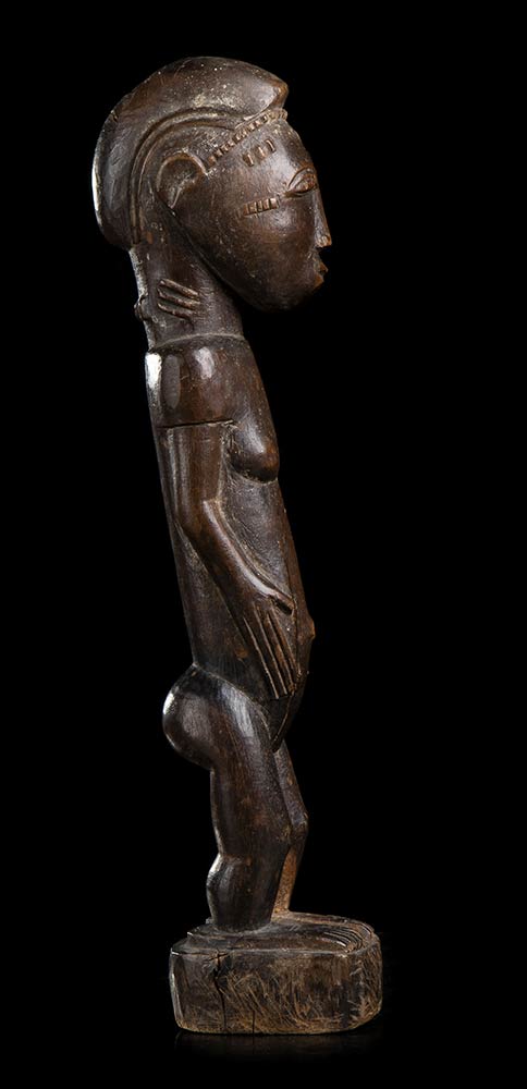 Scultura tradizionale autentica Baule che ritrae un uomo con scarnificazioni sul volto. Bella patina data dall'età. Costa d'Avorio, inizi XX secolo. Altezza: 33 cm.