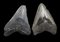 Due denti fossili di megalodon (Otodus Megalodon). Periodo Miocene. Altezza: 14 e 13 cm.