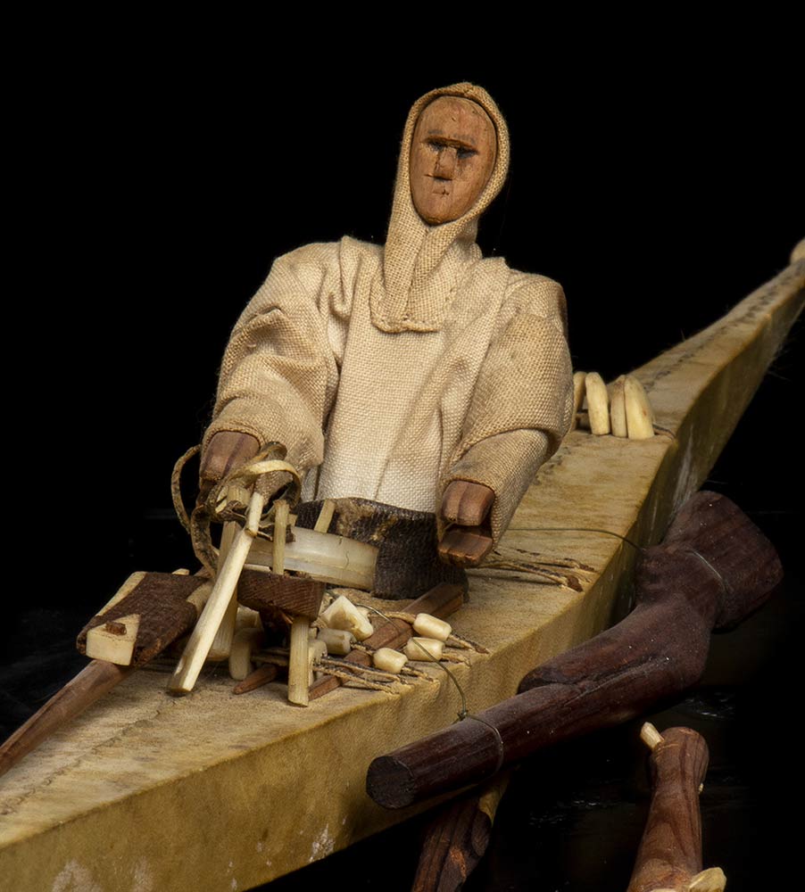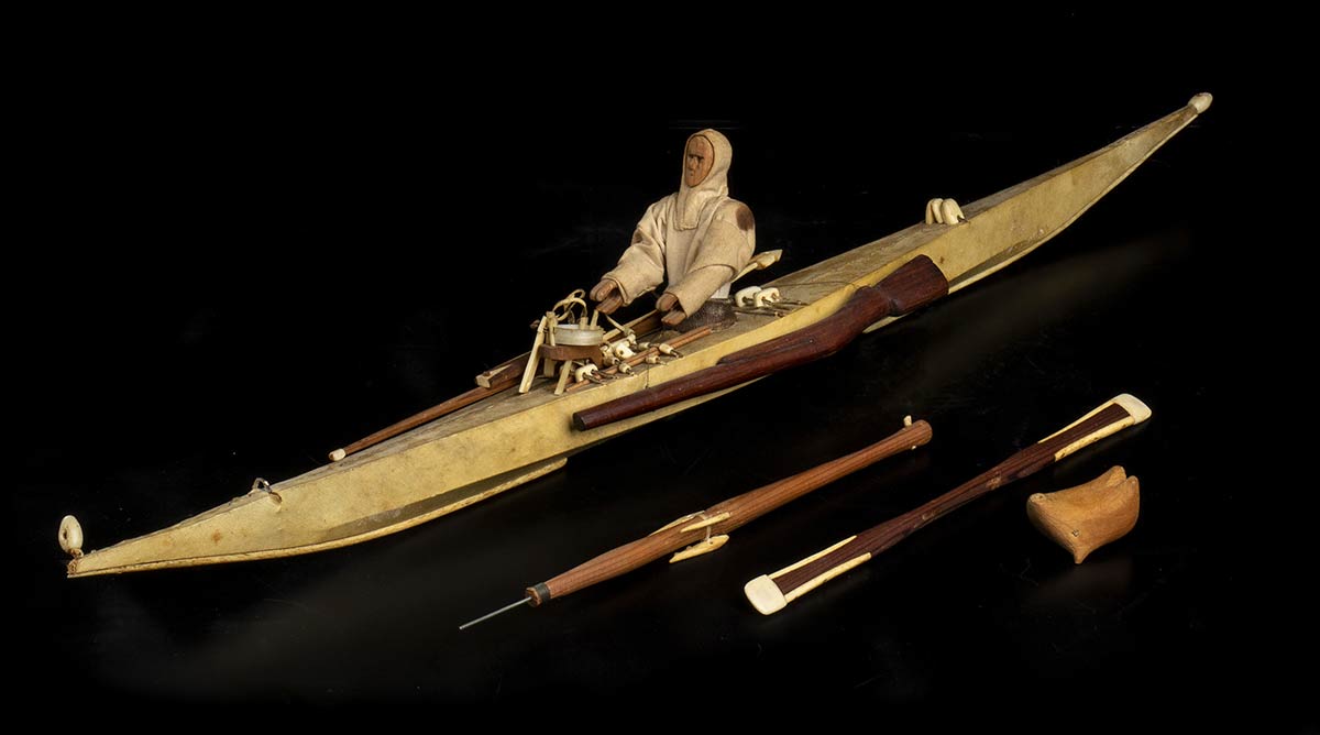 Modello di canoa Inuit sapientemente realizzata con legni autoctoni e stoffe del luogo di origine. Prima metà del XX secolo. Lunghezza 60 cm.