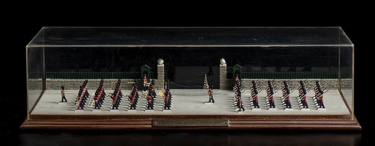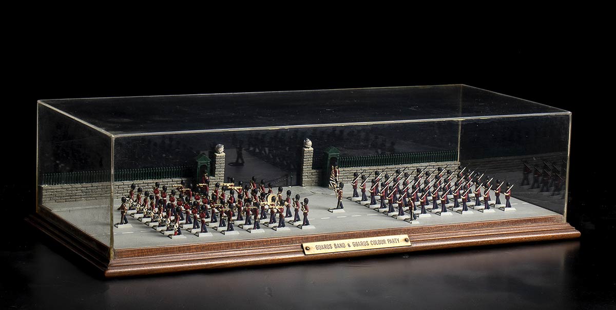Diorama inglese con la rappresentazione di una parata Reale, per un totale di 83 soldatini dipinti a mano. Inghilterra, metà XX secolo. Lunghezza 80 cm