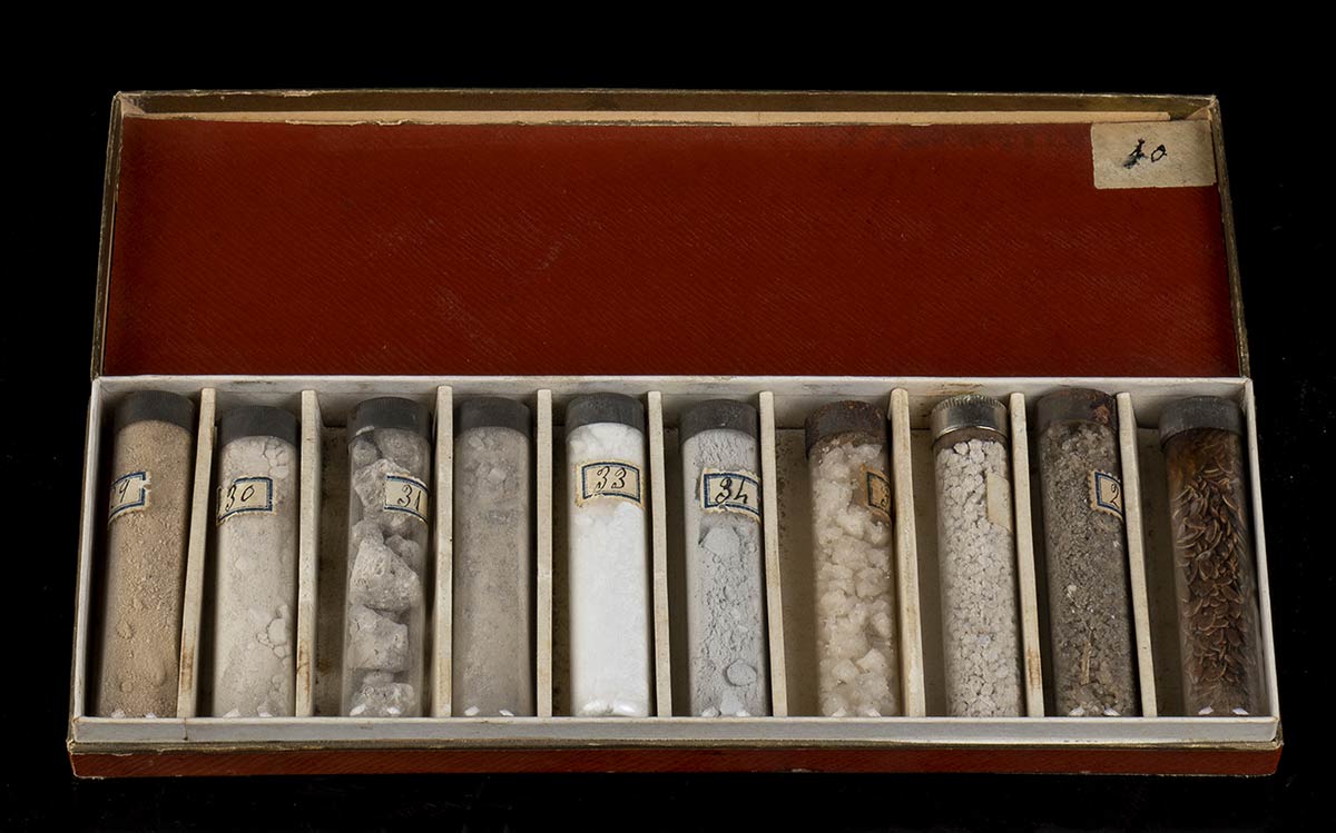 Astuccio con semi e terre di natura e origine diversa. Lunghezza 26 cm.