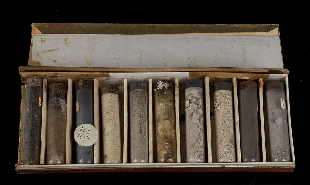Astuccio con semi e terre di natura e origini diverse. Lunghezza 26 cm