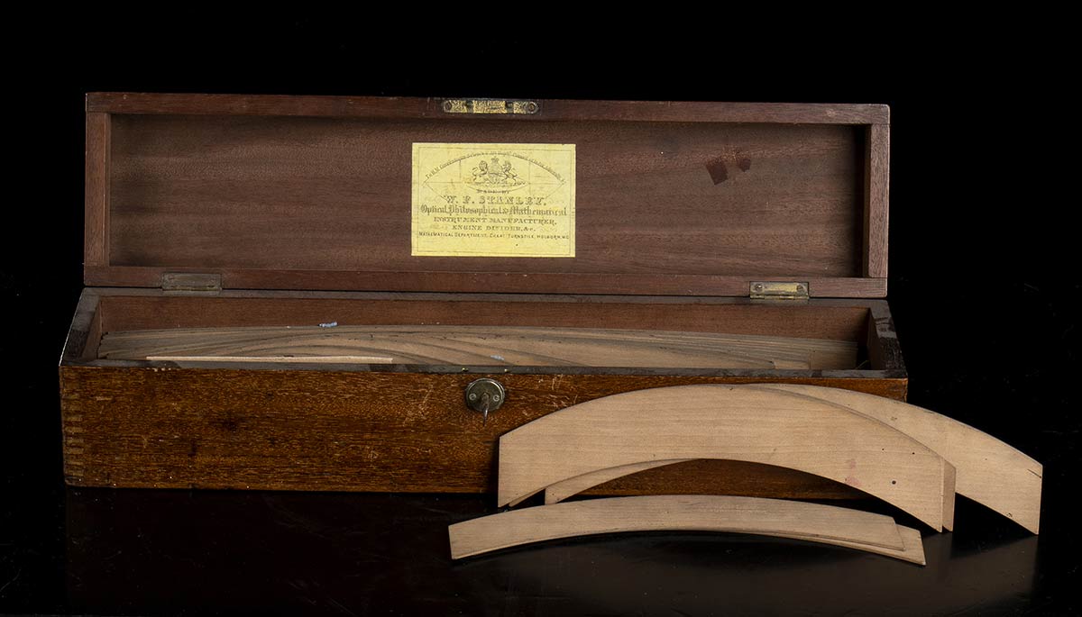 Astuccio con curve in legno per tracciare rotaie di origine inglese, fabbricato dalla W. F. Stanley sotto concilio di India. Inghilterra XIX secolo. Dimensioni: 44 x 12 x 10 cm