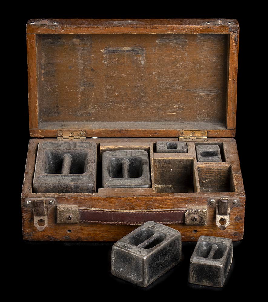 Astuccio con pesi in ferro di varie grandezze. Dimensioni: 28 cm x 16 cm x 11 cm.