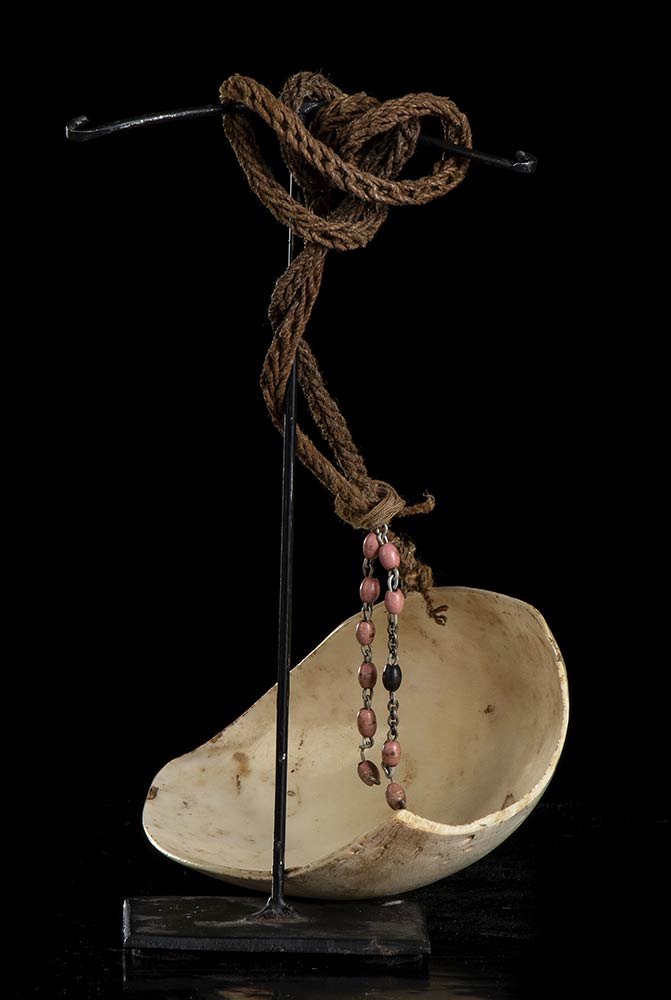 Collana ricavata da un'unica conchiglia tenuta da fibre vegetali. Papua Nuova Guinea. XX secolo. Base inclusa. Altezza: 25 cm