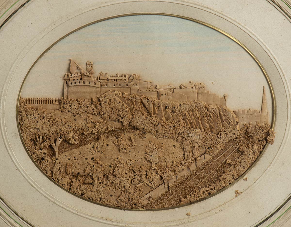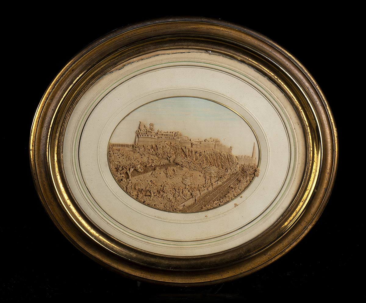 Paesaggio scolpito a mano nel sughero con cornice in legno. XX secolo. Dimensioni: 36 x 32 cm