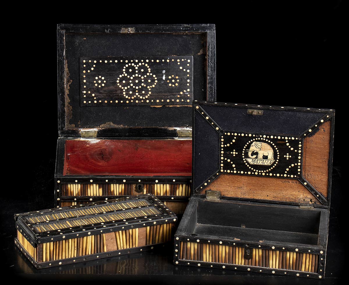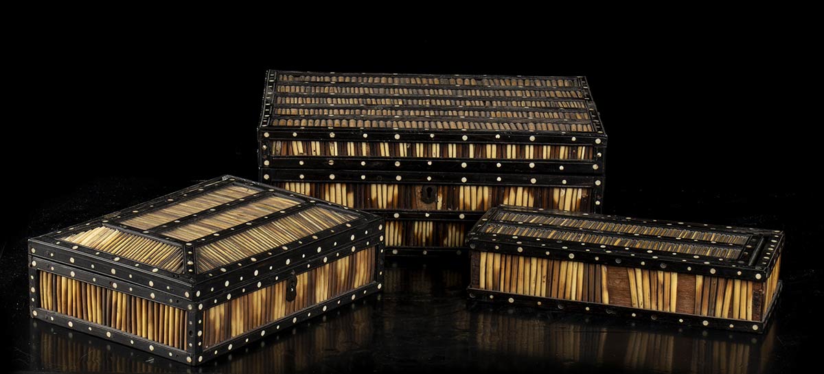 Tre scatole a contenitore di gusto orientale, probabilmente fabbricate in Africa o in Medio- Oriente, decorate con pughe di istrice comune. Lunghezze: da 22 cm a 27 cm cad.