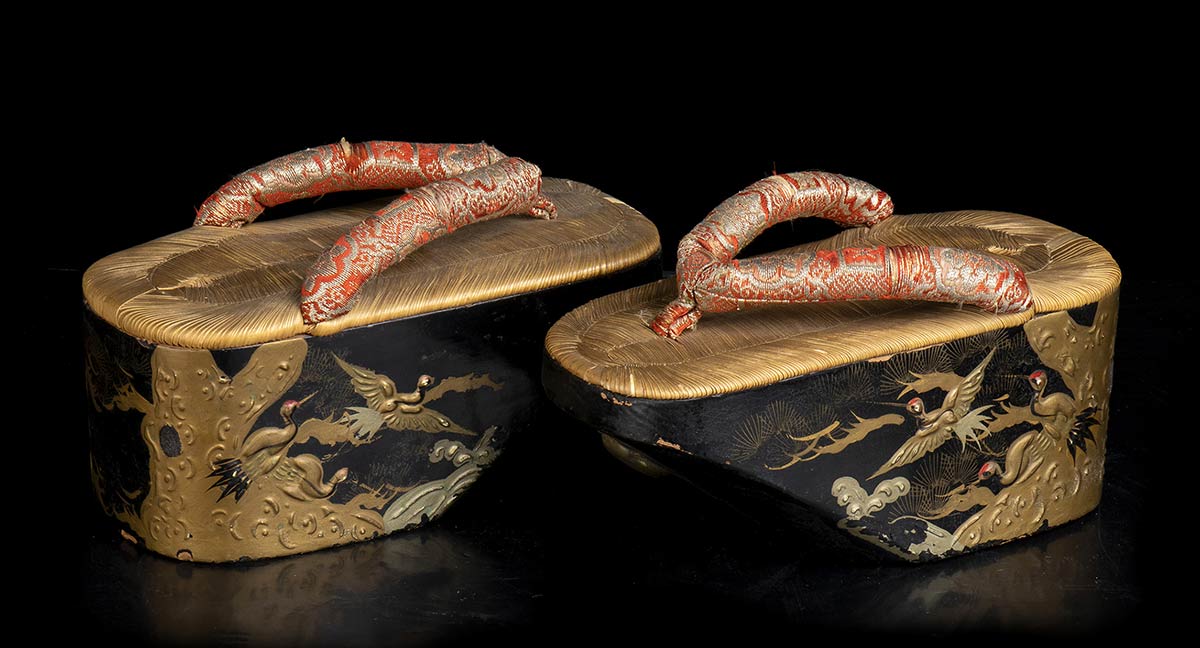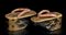 Coppia di zoccoli cinesi in legno e tessuto. Dimensioni: 20 cm x 11 cm x 9 cm
