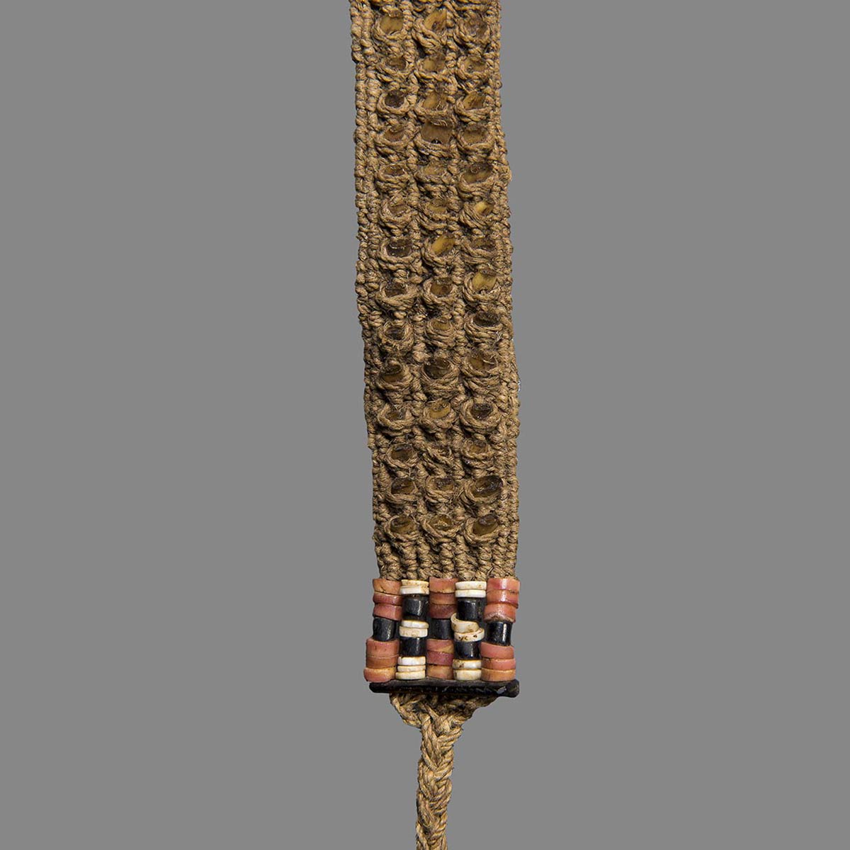 Ornamento cerimoniale da testa riservato esclusivamente agli uomini. Realizzato in conchiglia, fibre vegetali e denti di pipistrello. Isole Salomone, XIX secolo. Ex collezione Gilbert Hampden Manley. Lunghezza: 33 cm