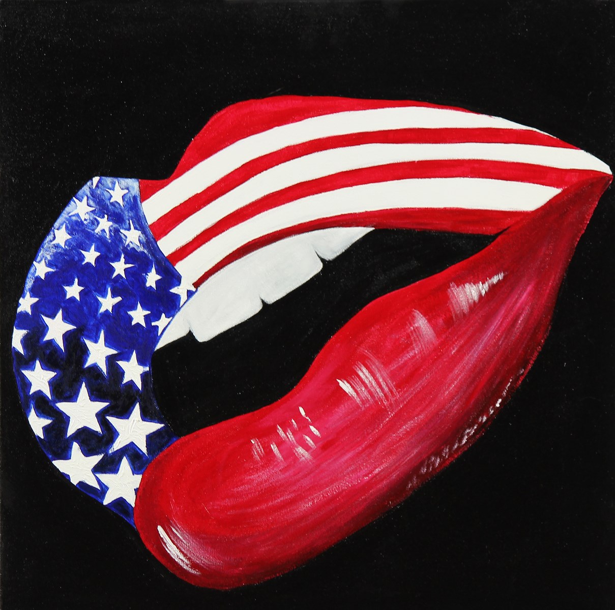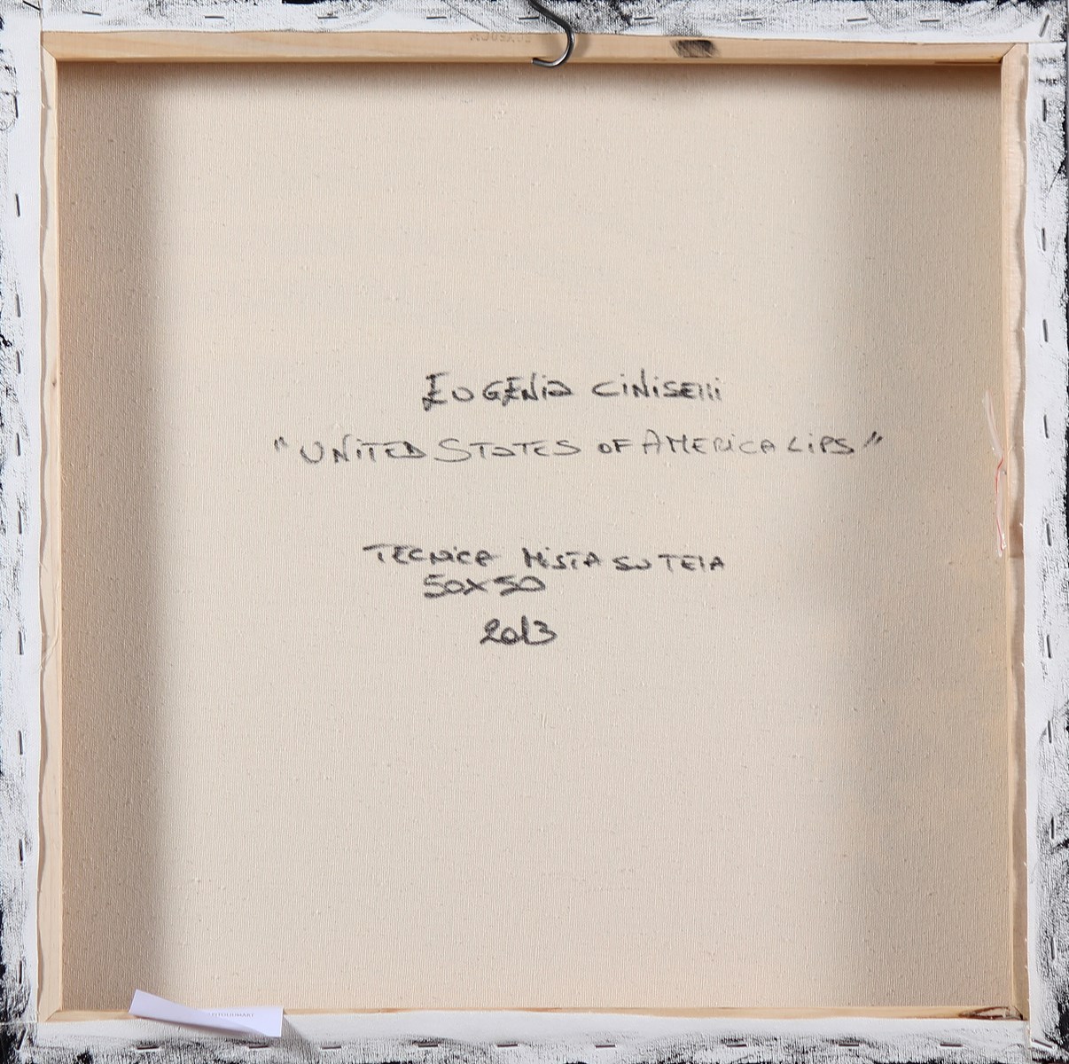 CINISELLI EUGENIA (n. 1971) United States of America Lips. 2013. Tecnica mista su tela. Cm 50,00 x 50,00 x 4,00. Al retro firma, titolo e data.