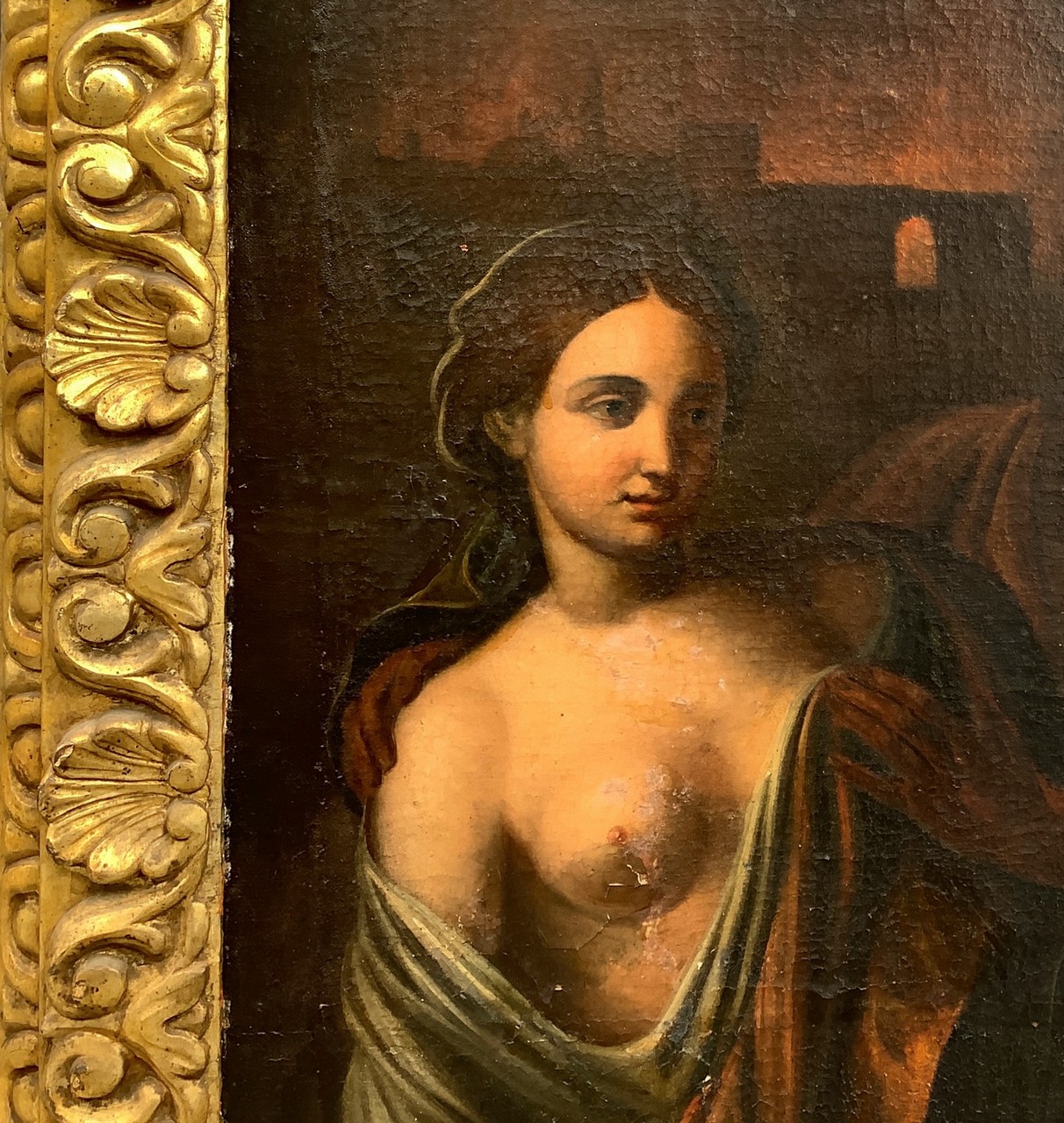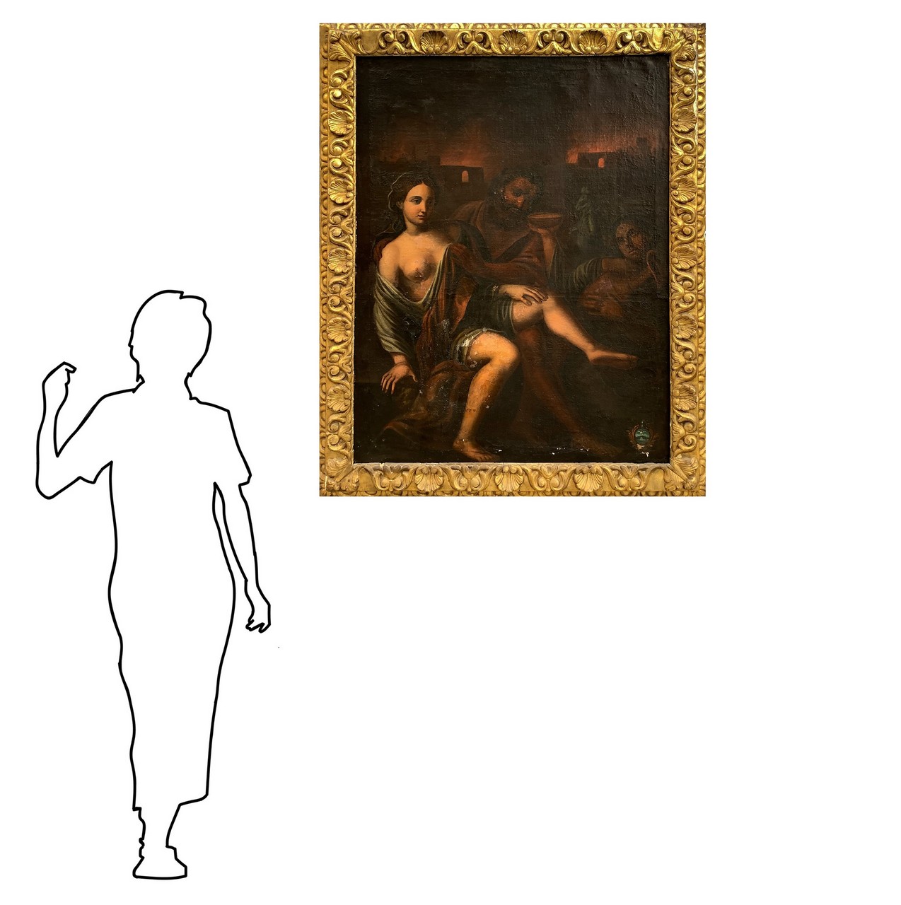 Lot e le figlie, in lontananza Gomorra, XVIII Secolo tela cm 117x91 in cornice cm 136x110 Dipinto ad olio su tela Pittore italiano del XVIII secolo. In splendida cornice coeva in legno dorato, dipinto in prima tela. Mancanze e cadute di colore